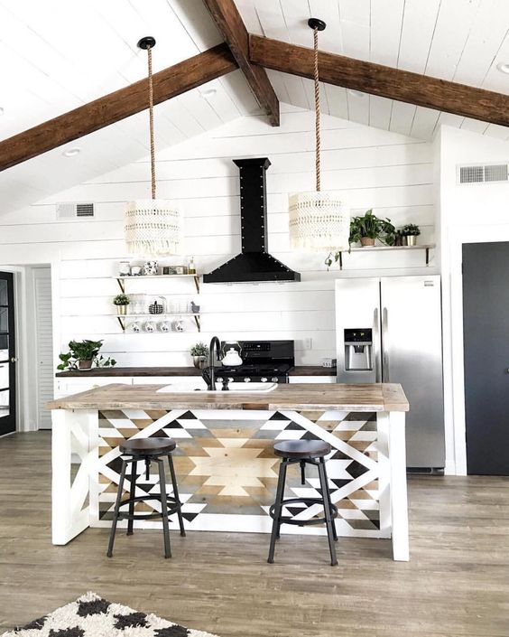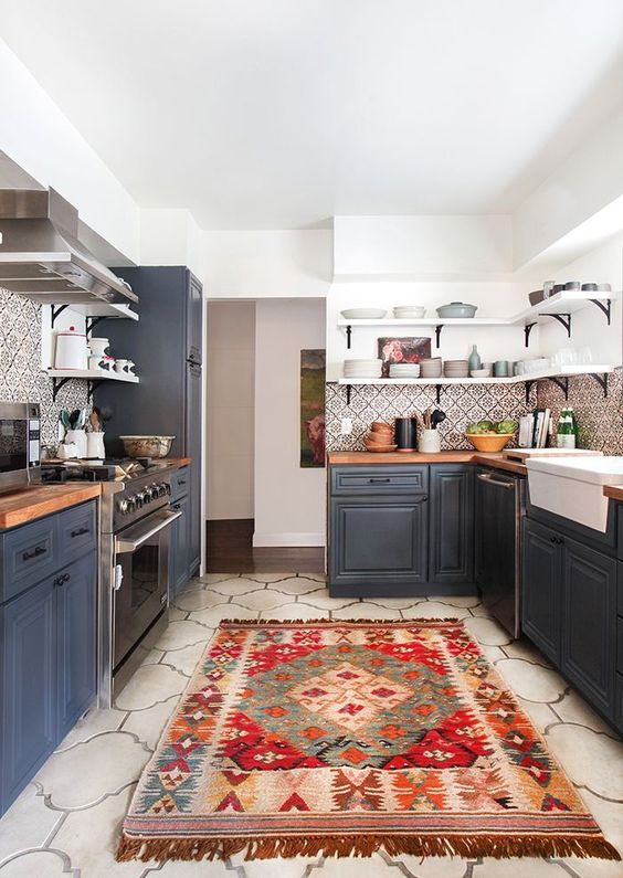 Vous aimez les intérieurs rustiques ? Alors pour cela, vous aurez besoin de motifs de murs cintrés et de tapis ethniques. Le tapis vous permettra d’apporter de la couleur, en opposition aux couleurs beige et blanc des murs de la cuisine.