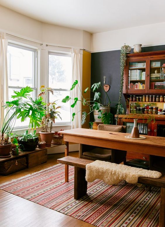 L’utilisation d’un jeu de couleurs claires associé à une table de cuisine en bois sombre et inhabituelle donnera à votre cuisine un look chic et serein. Avec la décoration de style bohémien, vous pourrez aussi mélanger les couleurs et les motifs pour un look chic et décontracté. Vous pouvez peindre les murs avec une couleur vive ou un mélange de couleurs.