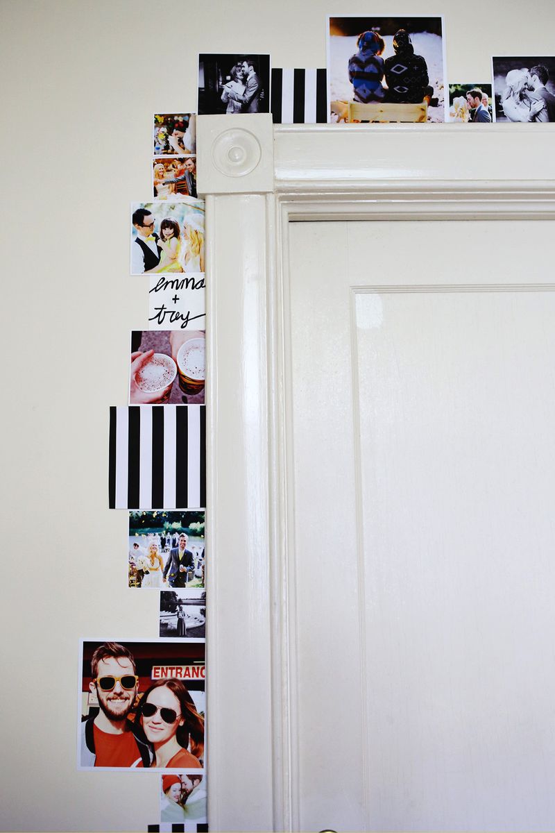 Composée de dix cadres photo de tailles différentes de même couleur (choisissez-les de couleur blanche, noir ou bois), cette disposition vous permet de créer une petite galerie de quelques photos mélangeant différents lieux et différents sujets. Le deuxième exemple, imaginé par A Beautiful Mess, utilise des photos extraites de photos prises avec un iPhone mais vous pourriez tout à fait utiliser vos photos Instagram par exemple.