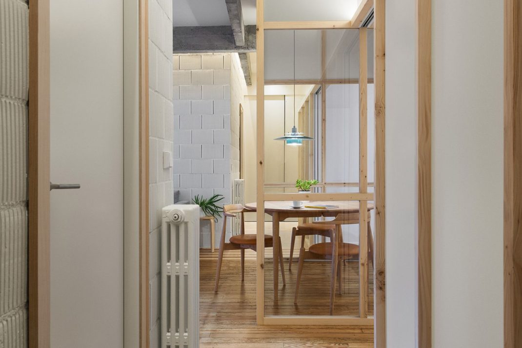 Voyons maintenant comment fusionner le bois et le béton dans cet appartement de cent mètres carrés qui dispose d’une façade de forme polygonale ; un inconvénient qui est vite devenu un avantage ! Partant de cela, PAUZARQ arquitectos a choisi d’utiliser ce mur pour orienter la salle à manger. Cet espace construit de toute pièce fait face à cette façade et défini un peu la circulation globale de l’appartement. Finalement, ce polygone devient le point focal de l’appartement.