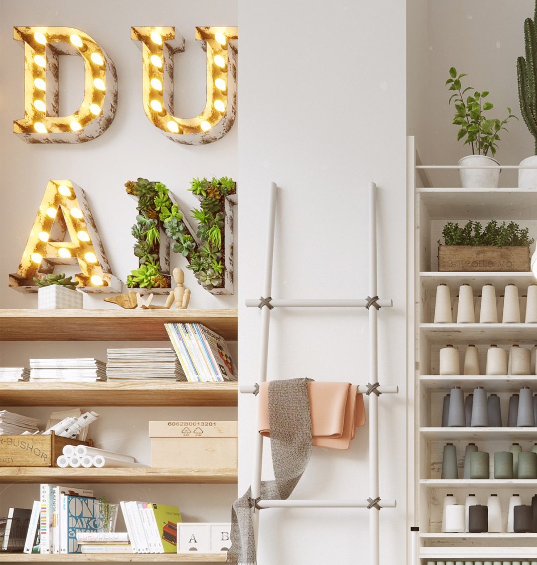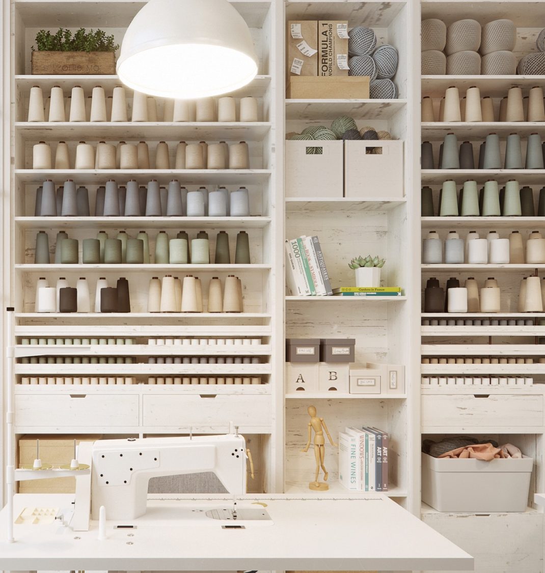 Quand le style déco japonais est mélangé avec le meilleur de la décoration scandinave, la fusion est aussi étonnante qu’époustouflante. Ce studio créatif est rempli de fournitures de couture et d’équipements connexes. Ils s’intègrent parfaitement et deviennent même des éléments décoratifs.