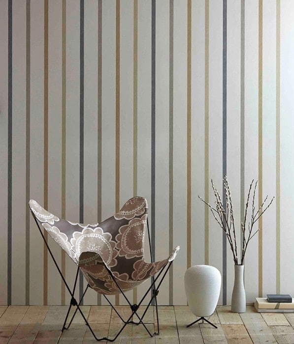 Autre style que j’aime bien : le papier peint à rayures. Je le trouve très graphique et créant une certaine illusion d’optique qui permet d’agrandir une pièce. Je vous ai donc sélectionné le modèle Mendrik, le modèle Sabira, le modèle Old Planks et le modèle Almeda.