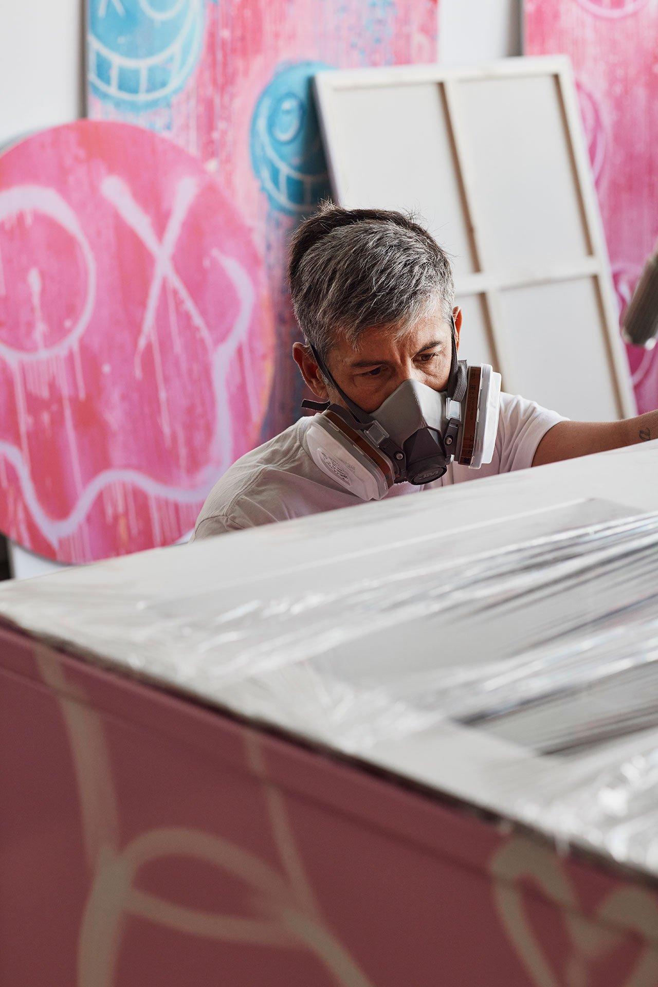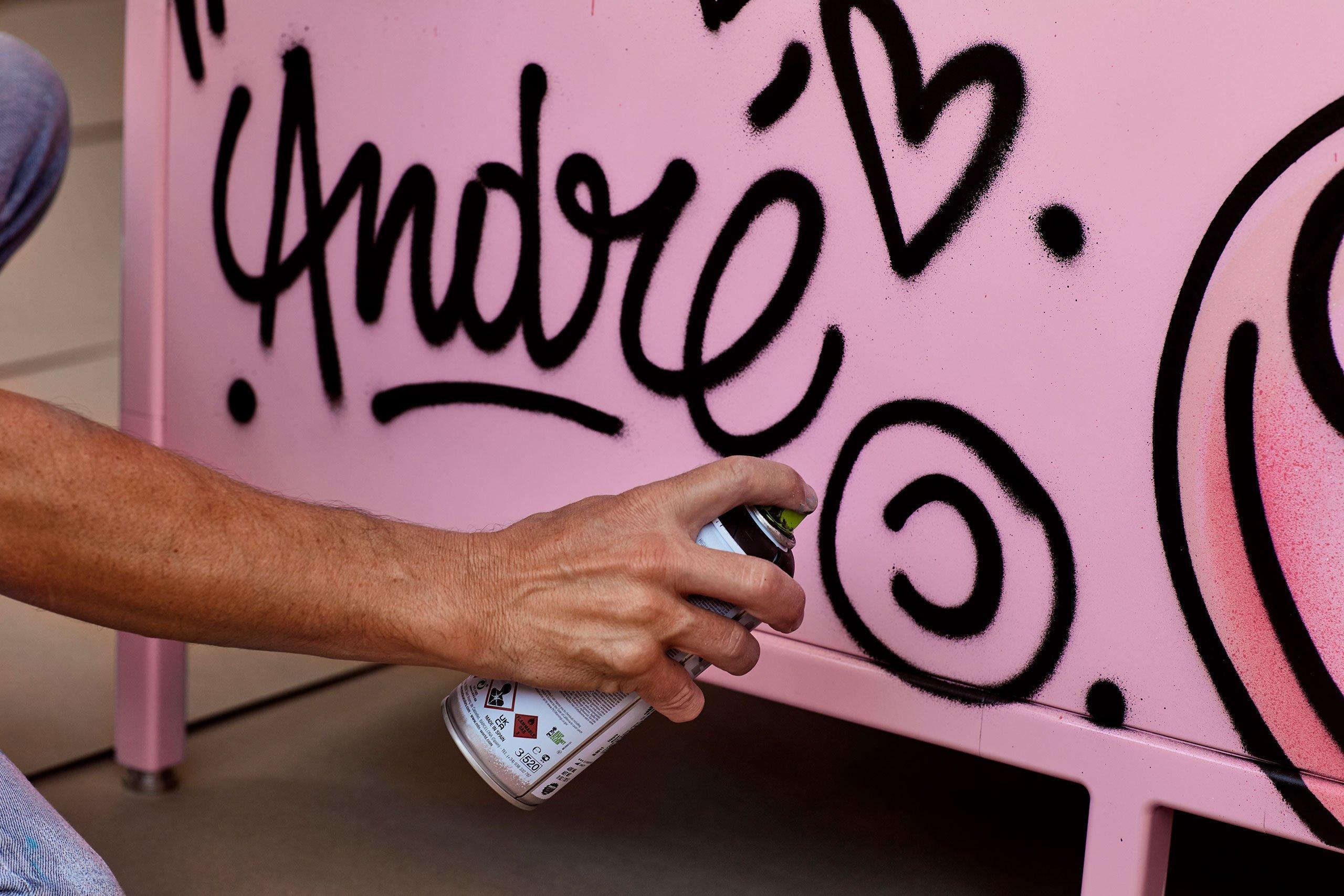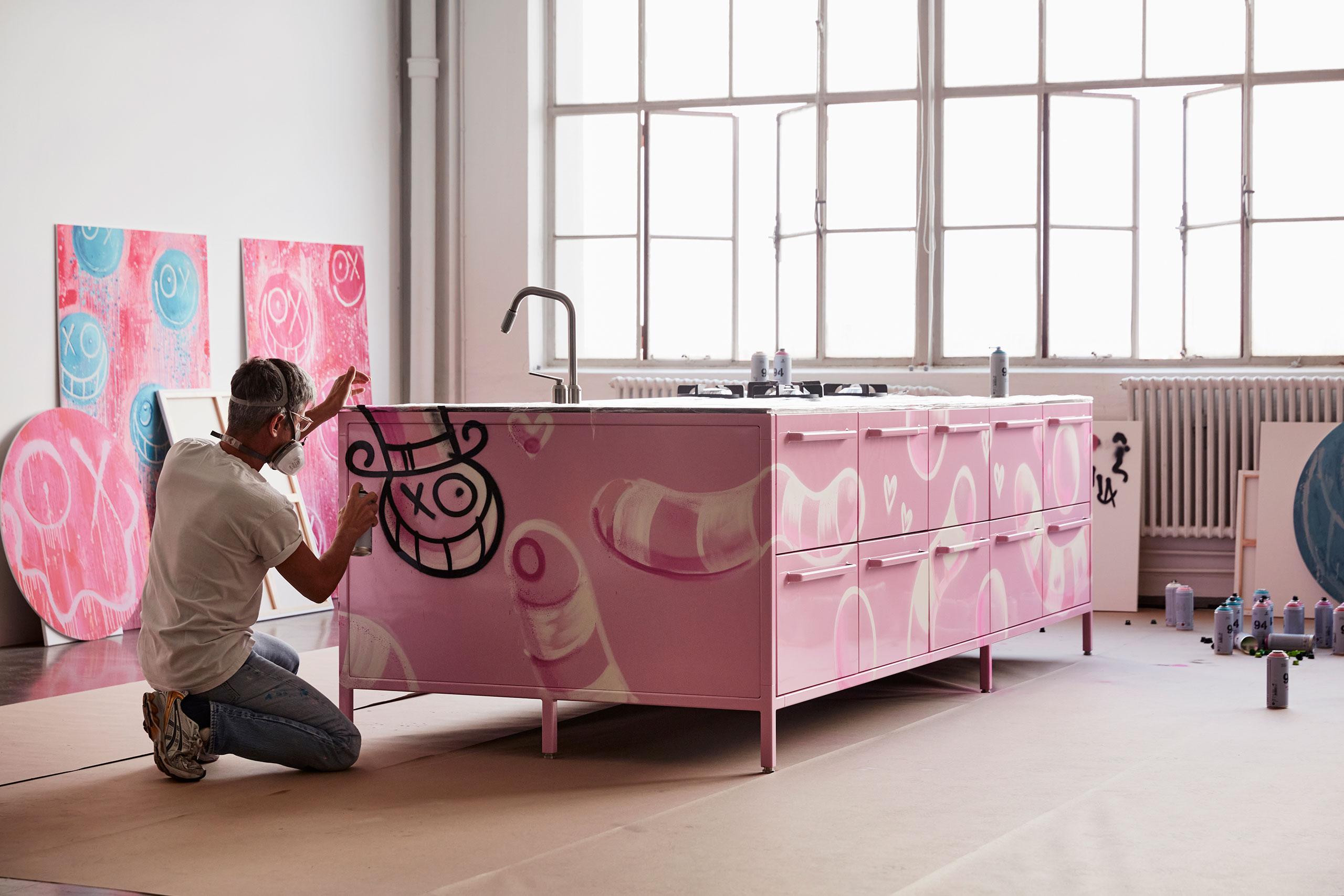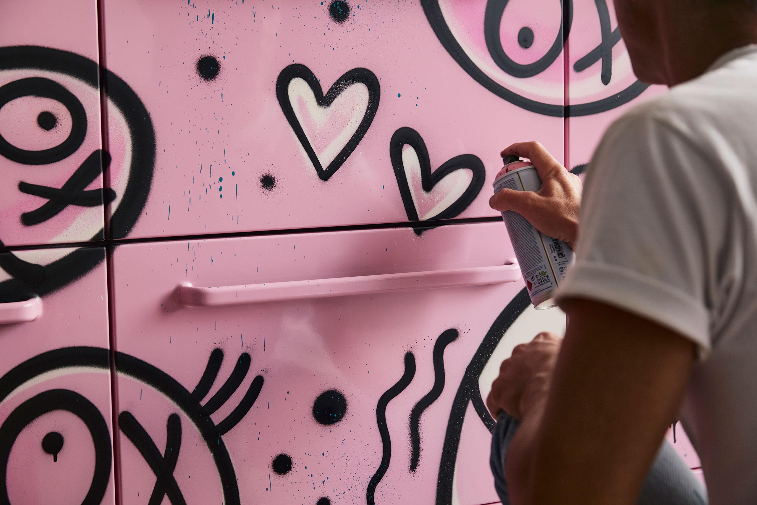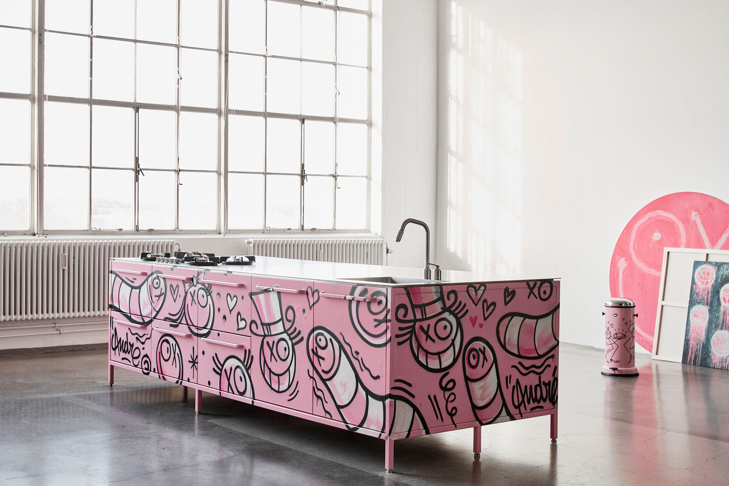 Amour Edition est une collaboration entre le graffeur français d’origine suédoise André Saraiva et la marque danoise d’articles ménagers Vipp. L’œuvre rose d’André Saraiva, composée de personnages de bandes dessinées, n’a rien à voir avec les éléments de cuisine haut de gamme noirs et épurés qui font la renommée de Vipp.