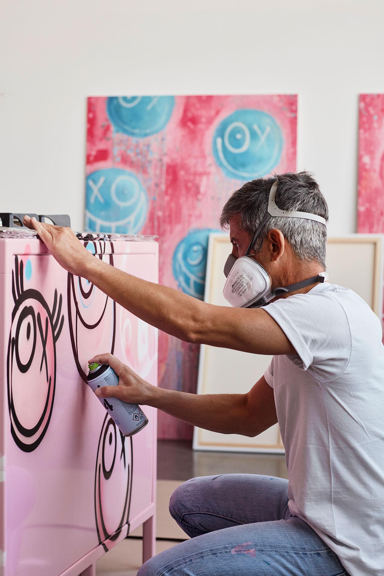 L’îlot de cuisine et la poubelle design à pédale en édition limitée qu’André Saraiva a réimaginés dans son style caractéristique sont donc une leçon du potentiel créatif des partenariats inattendus. Ils sont revêtus de rose bonbon et graffités d’une troupe de personnages de dessins animés ; dont l’alter ego au visage rond d’André Saraiva, Mr. A.