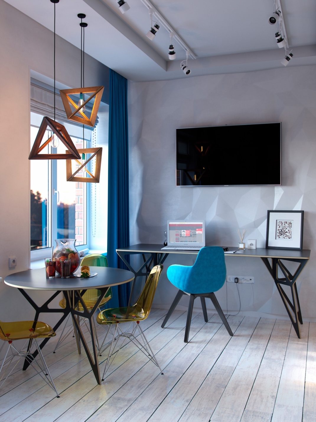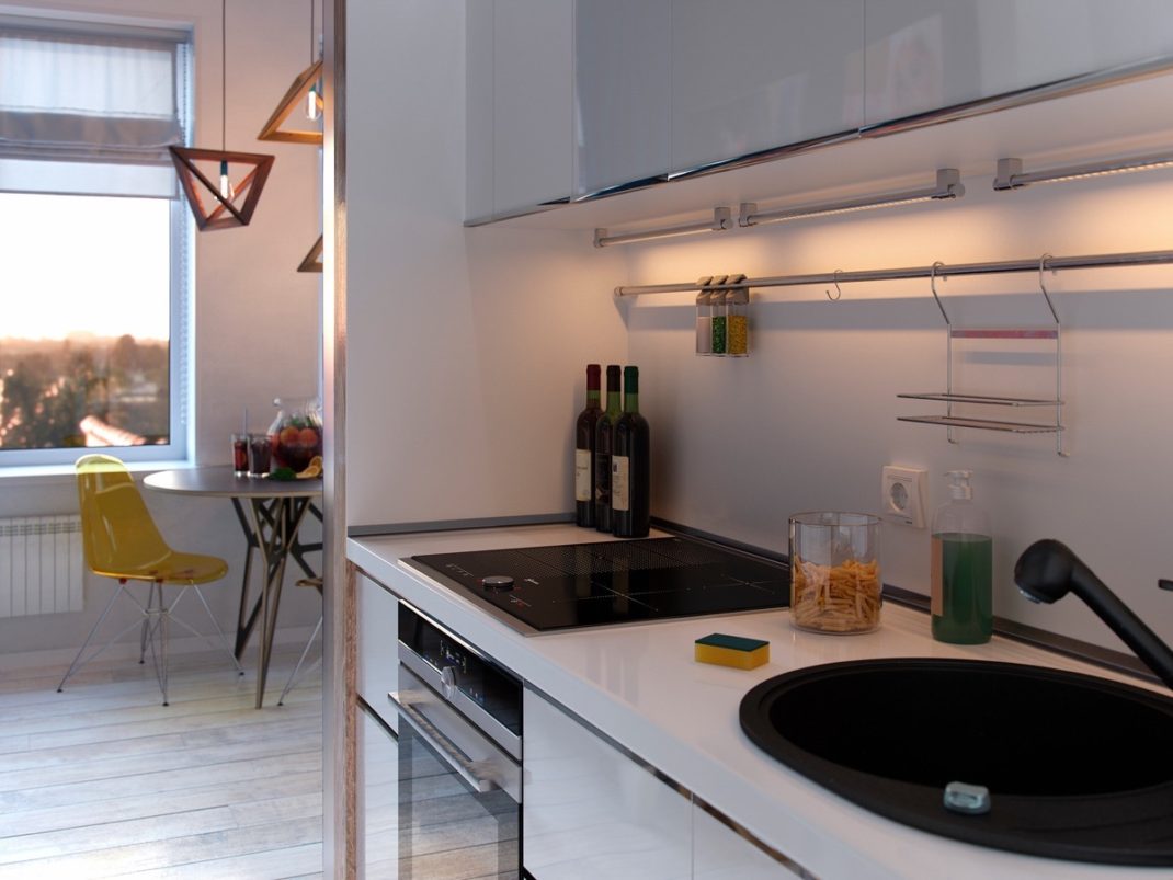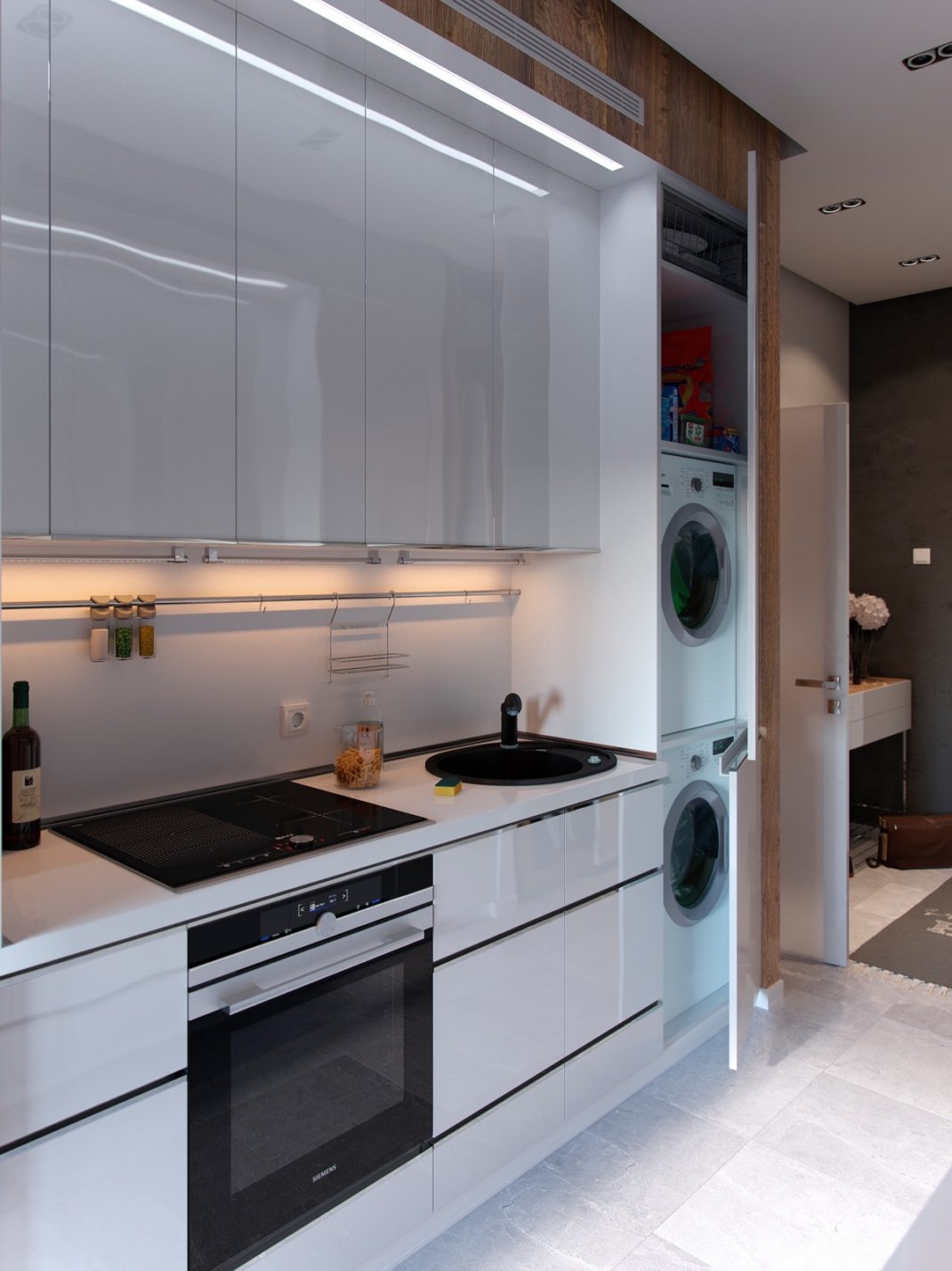 Cet appartement se démarque aussi grâce à son agencement. Vraiment ingénieux, il permet de garder l’espace ouvert et de conserver impression d’espace. Dans cette pièce de 30 mètres carrés, nous avons une chambre, une cuisine, un salon, une salle de bain, un bureau et une entrée. Toute chose a une place et tout les espaces sont exploités à l’extrême. Les solutions de stockage intelligentes dans la cuisine permettent de ranger tout le matériel et toutes les machines nécessaires. Comme il n’y a pas de fenêtre, le décorateur a utilisé des surfaces brillantes pour refléter la lumière.