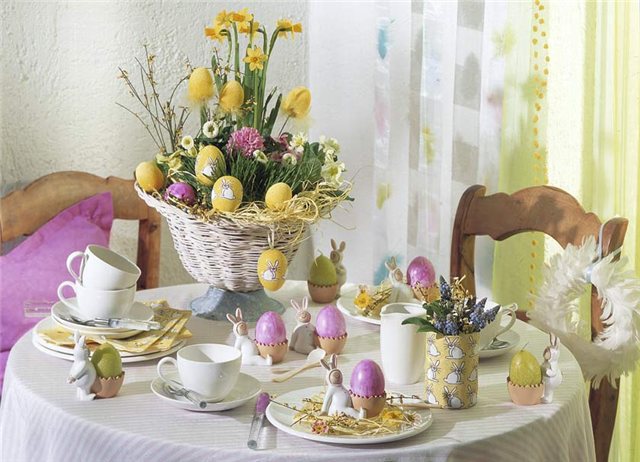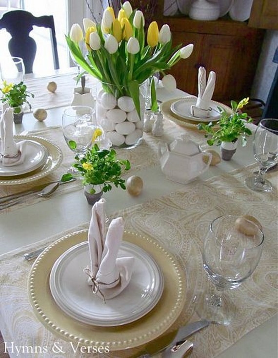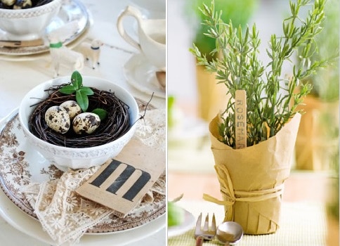 Avec Pâques arrive le printemps ; et qui dit printemps dit fleurs. Elles doivent donc avoir une place centrale sur votre table. Assurez-vous que vos fleurs apportent de la couleur mais aussi et surtout de la verdure ? Jaunes, crèmes ou blanches, elles habilleront à la perfection votre table. Pensez aussi aux plantes herbacées qui mettront en valeur vos œufs.