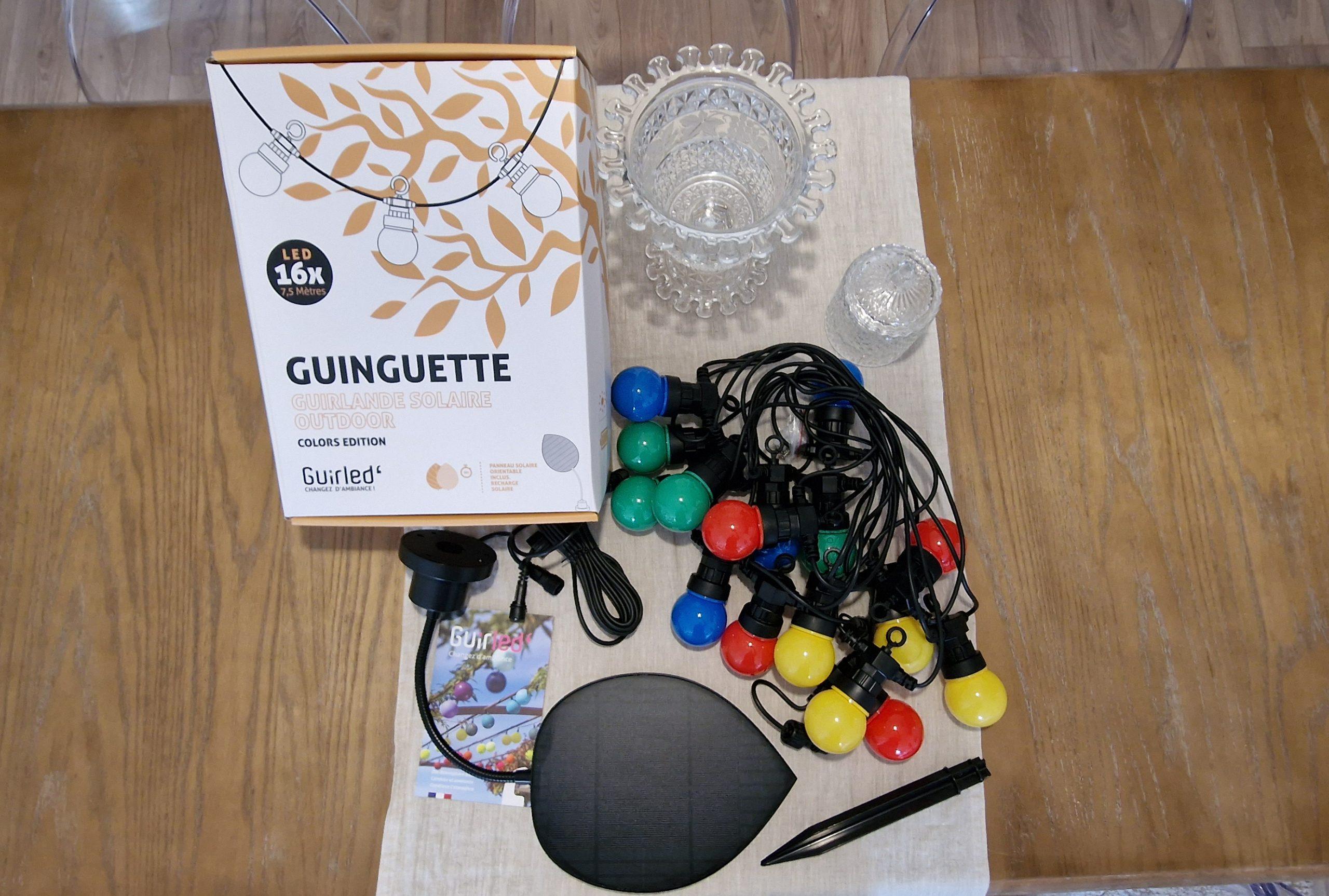 Comme je vous le disais, Guirled m’a envoyé une guirlande Guinguette, édition Colors ; et plus précisément le pack classique Guinguette qui comprend une guirlande Guinguette 16 LED de 7,5 mètres, un panneau solaire et une rallonge de 4 mètres.