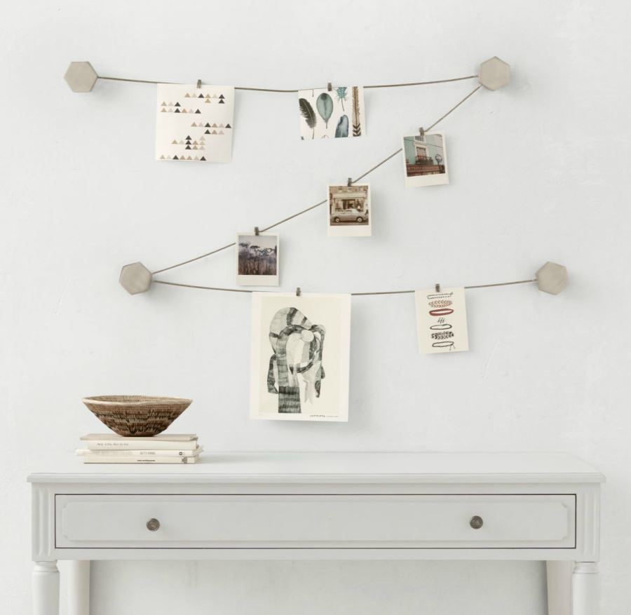 Si vous n’avez pas le budget pour acheter de nombreux cadres, je vous conseille d’afficher vos photos … sur une corde. Avec cette technique, vous pourrez afficher vos photos préférées en les clipsant sur une simple corde fixée au mur. Vous pourrez fixer une seule corde ou jouer sur une effet de répétition. Horizontalement, verticalement, en zigzag, associée à des morceaux de bois, fixée entre deux suspensions … toutes le combinaisons sont possibles.