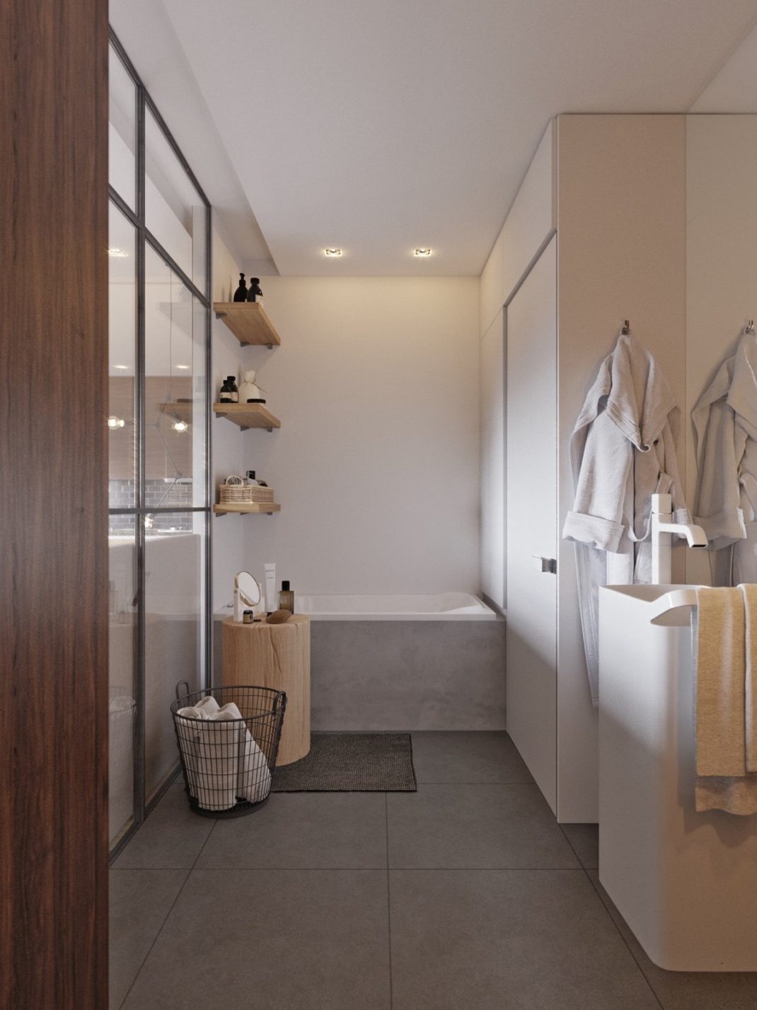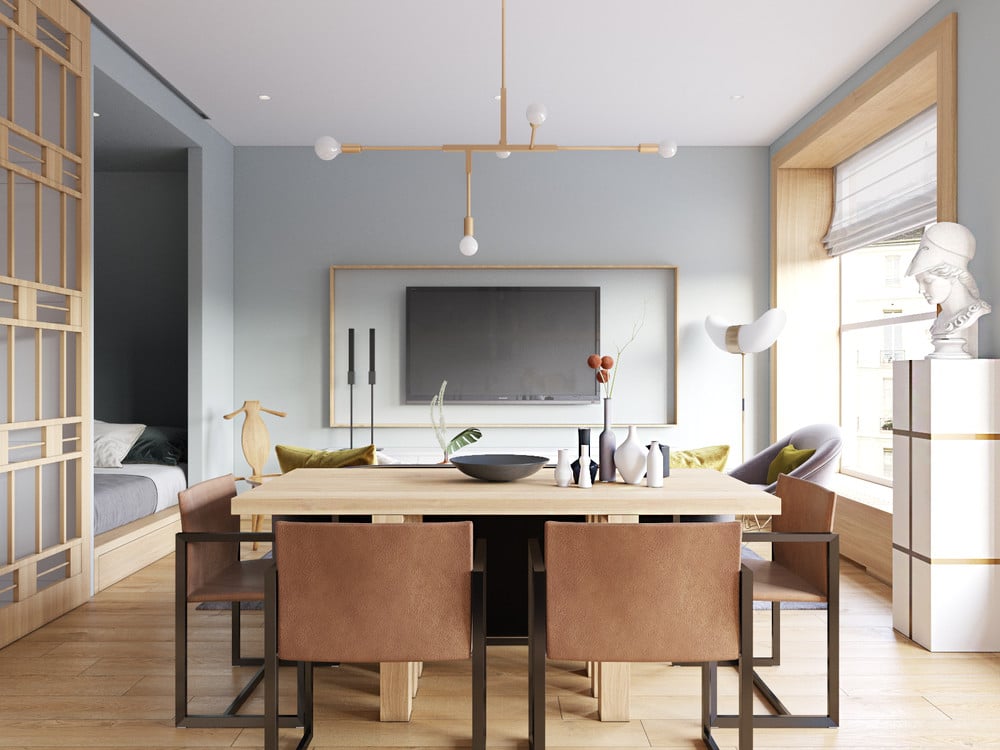 Troisième studio, troisième style. Ici, un ensemble de couleurs laconiques jumelé à des éléments en bois pour créer un intérieur chaleureux et esthétique.