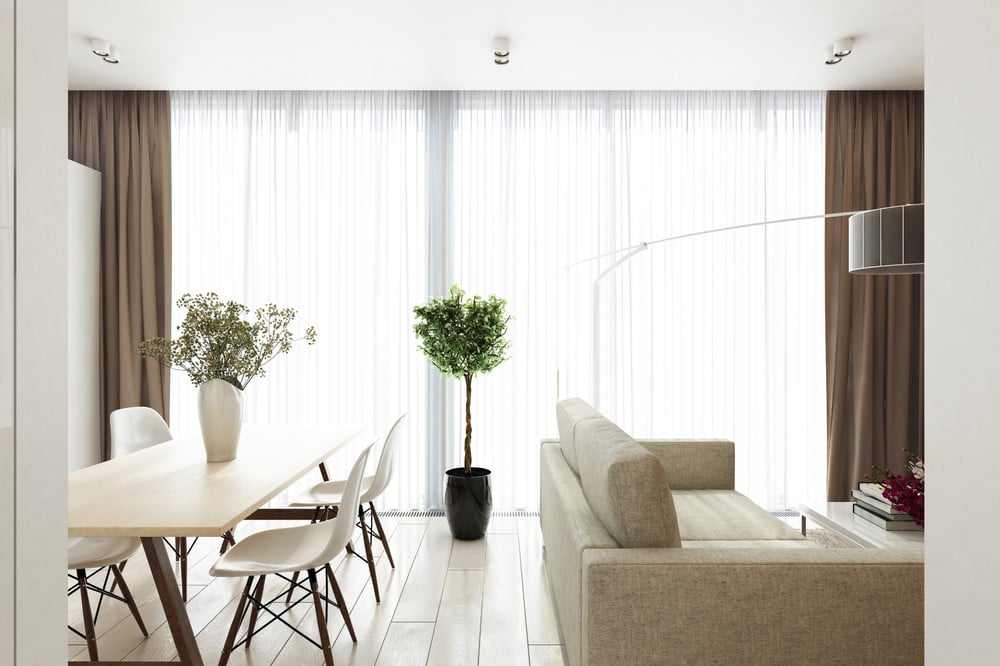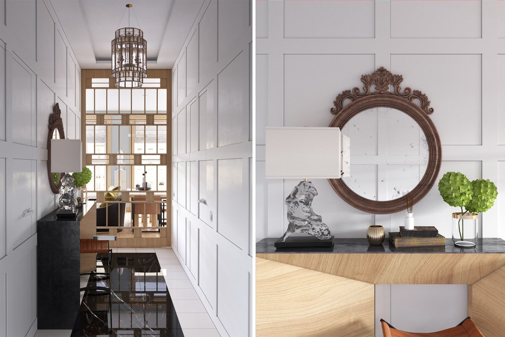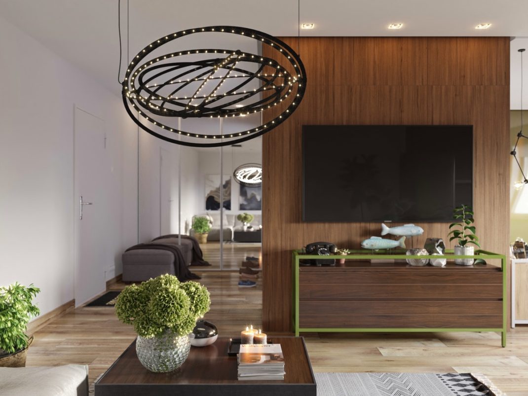 Première astuce : un lustre noir symétrique qui attire l’œil. Elle permet d’agrandir l’espace. Ici, nous retrouvons aussi de nombreux composants organiques qui rendent l’espace plus frais et permettent de refléter la personnalité des habitants. Un plancher en bois lisse et des paysages abstraits complètent le tableau. L’utilisation de panneaux de bois sombre pour décorer le mur adjacent à la paroi blanche permet d’adoucir le blanc et réchauffe tous ces éléments organiques.