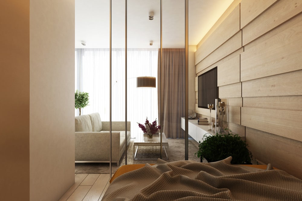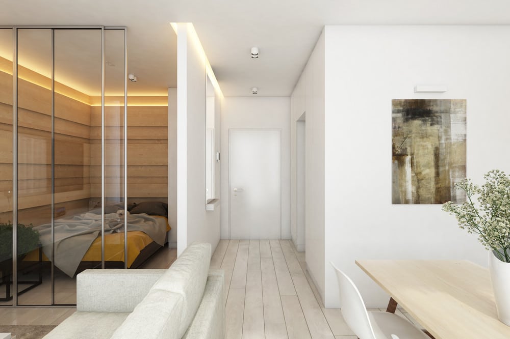 Bien évidement, une des astuces et pièce maîtresse de ce studio, c’est ce mur en verre avec un cadre en métal noir C’est une excellente astuce déco permettant de séparer la chambre à coucher du salon. En fait, ici, seuls les espaces nécessaires sont fermés par des murs pour maximiser l’espace au sol.