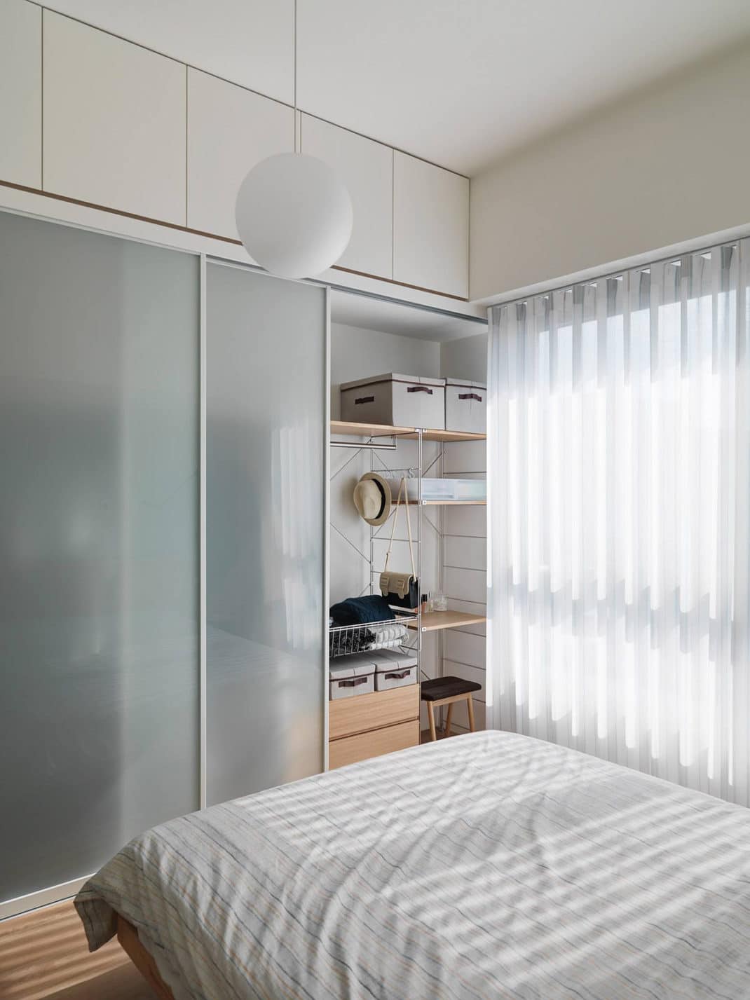 La lumière du soleil inonde l’intérieur. Plutôt que d’opter pour un blanc neutre, le designer a choisi une teinte douce et chaleureuse pour accentuer l’effet apaisant et confortable de l’espace. Malgré sa simplicité, la maison n’est pas dénuée de caractère : animaux en peluche, imprimés ludiques, livres, etc. Cette maison est une maison qui vit.