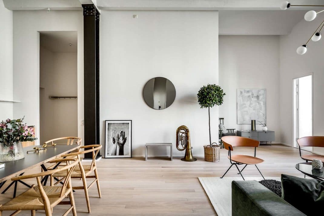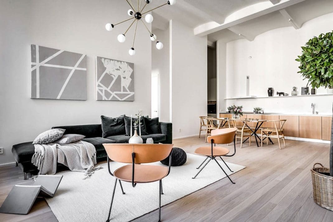 Cet appartement est un appartement de style loft, lumineux et spacieux. Le salon principal est globalement simple avec des éléments assez communs, comme des plantes d’intérieur et un canapé confortable. Cependant, l’ajout d’éléments du design scandinave ressortent tout de suite. Je pense notamment aux chaises.