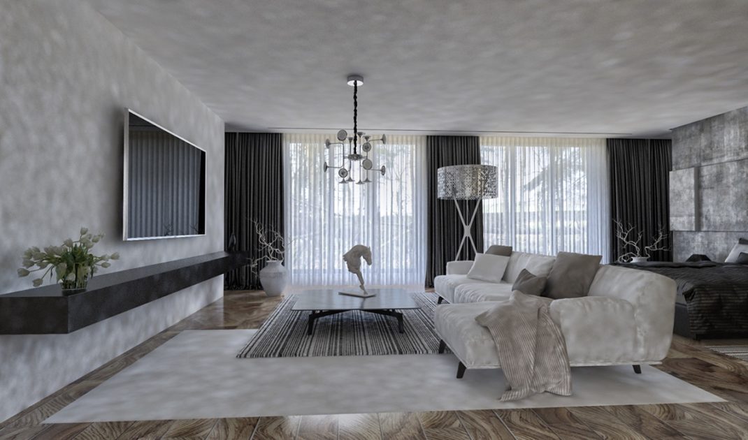 Le salon est décoré avec goût à l’aide de nombreuses œuvres d’art et des motifs modish. Le tout apporte encore un peu plus de profondeur et de style à la pièce. Une lampe figurant un grand cheval ornemental apporte une touche d’originalité à l’ensemble.