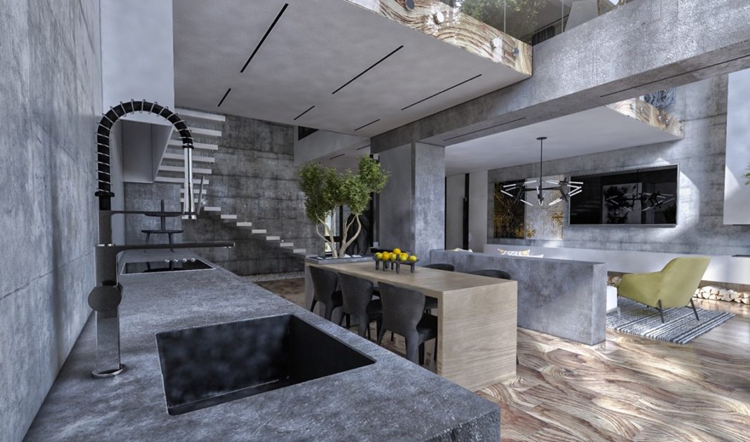 Petite astuce : le bois empilé sous l’écran TV ajoute une torsion unique sur un élément organique. Autre élément organique : les magnifiques bonsaïs que l’on retrouve dans le salon et directement intégré dans un meuble dans la cuisine. La verdure luxuriante des bonsaïs et le jaune vif des citrons égayent toute la pièce et ajoutent un éclat de couleur nécessaire. Les citrons peuvent être échangés selon la saison, assurant un ornement toujours changeant.