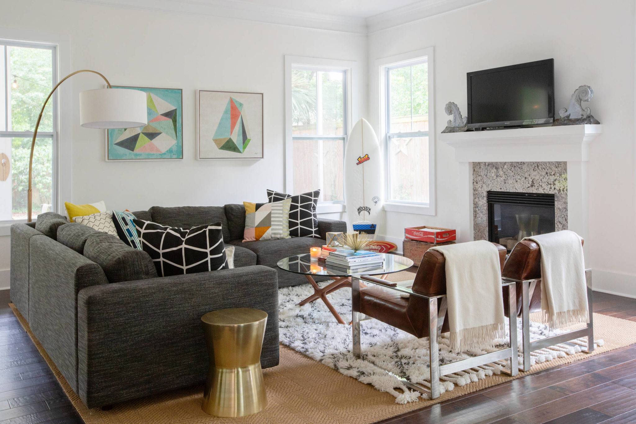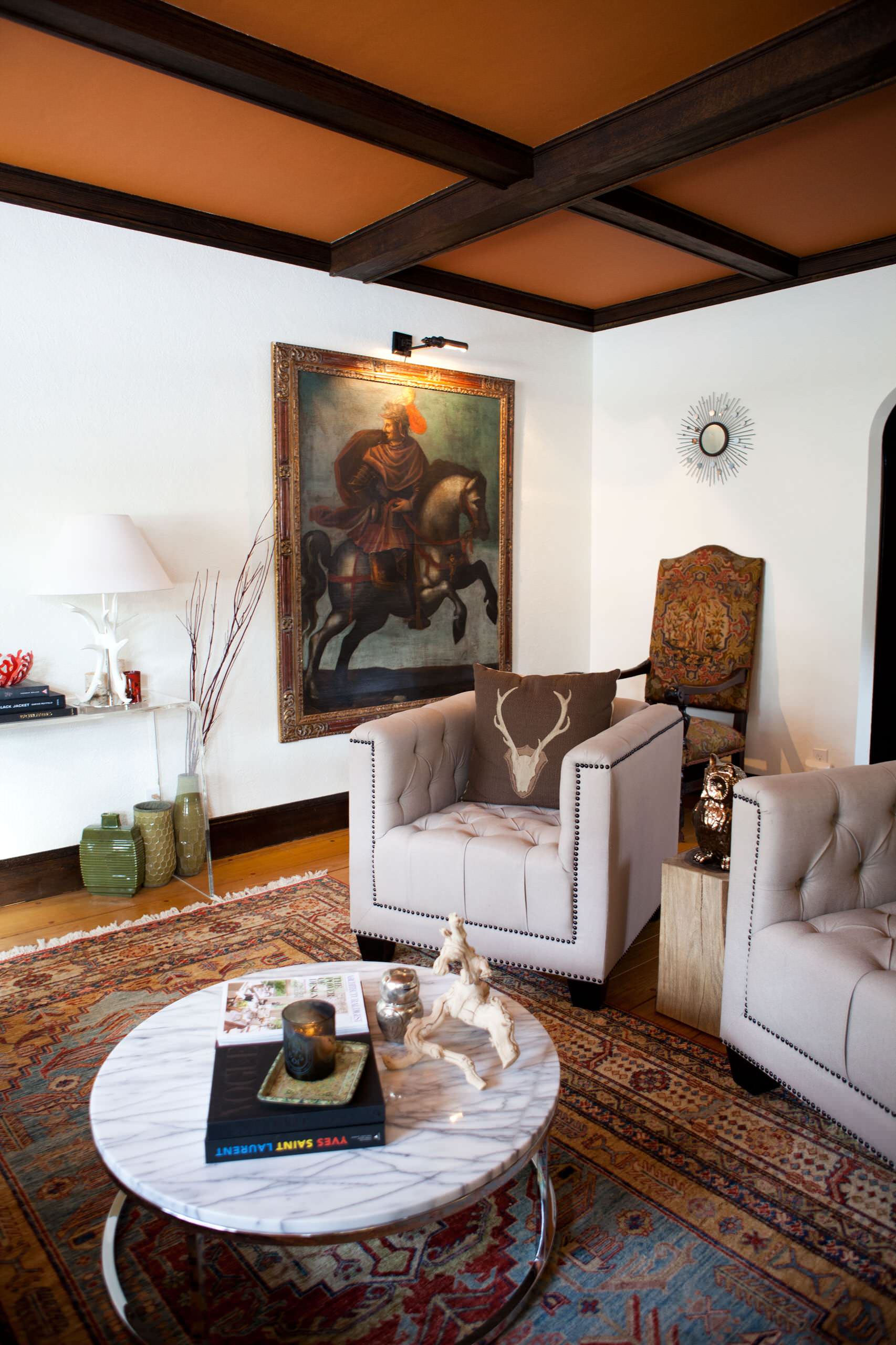Lorsque l’on aime mélanger les styles déco, il est facile de franchir la ligne et d’obtenir un résultat autre que celui escompté. Pour éviter cela, assurez-vous de déterminer un schéma de couleurs et de vous y tenir. Des couleurs répétitives permettront de lier l’espace et d’obtenir un résultat harmonieux. Le schéma de couleurs de ce salon emprunte les tons terreux du tapis marocain pour plus de cohérence.