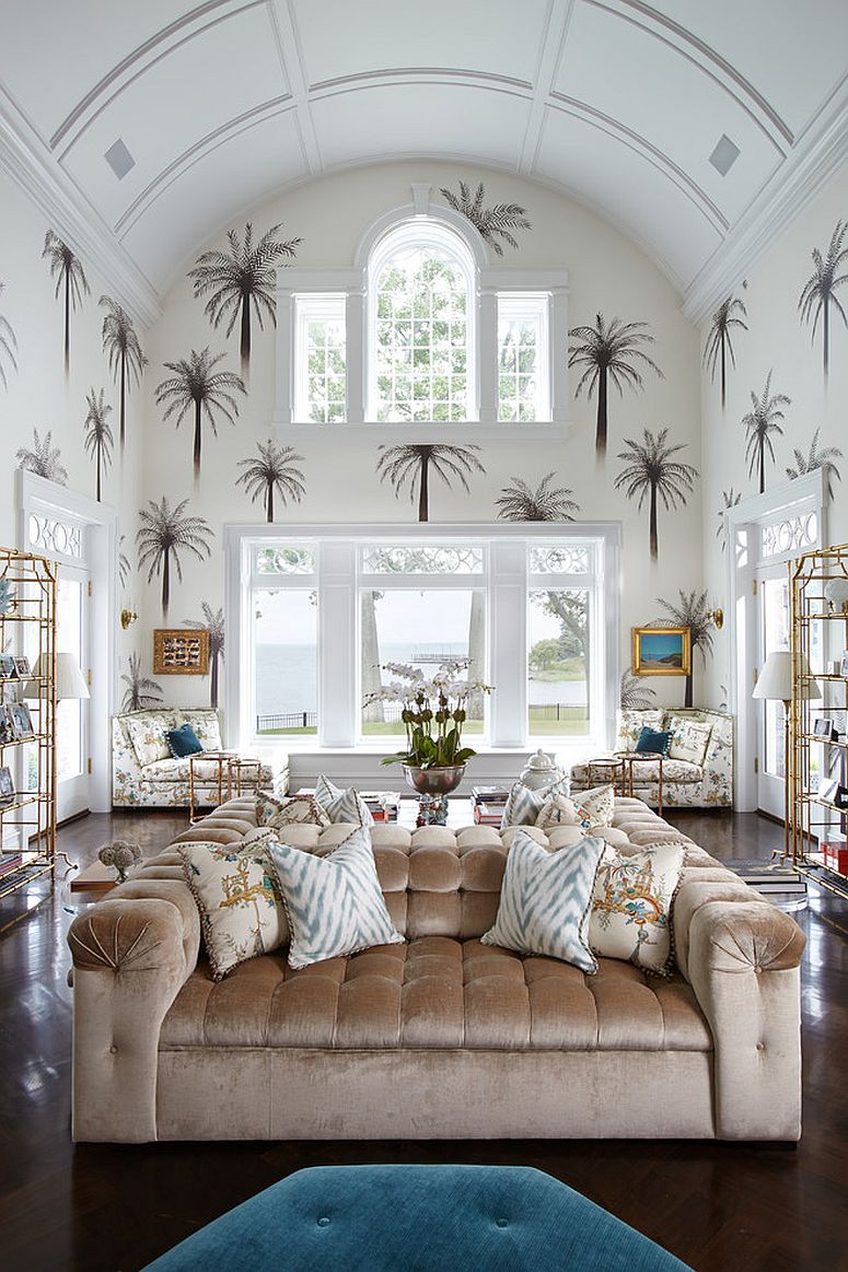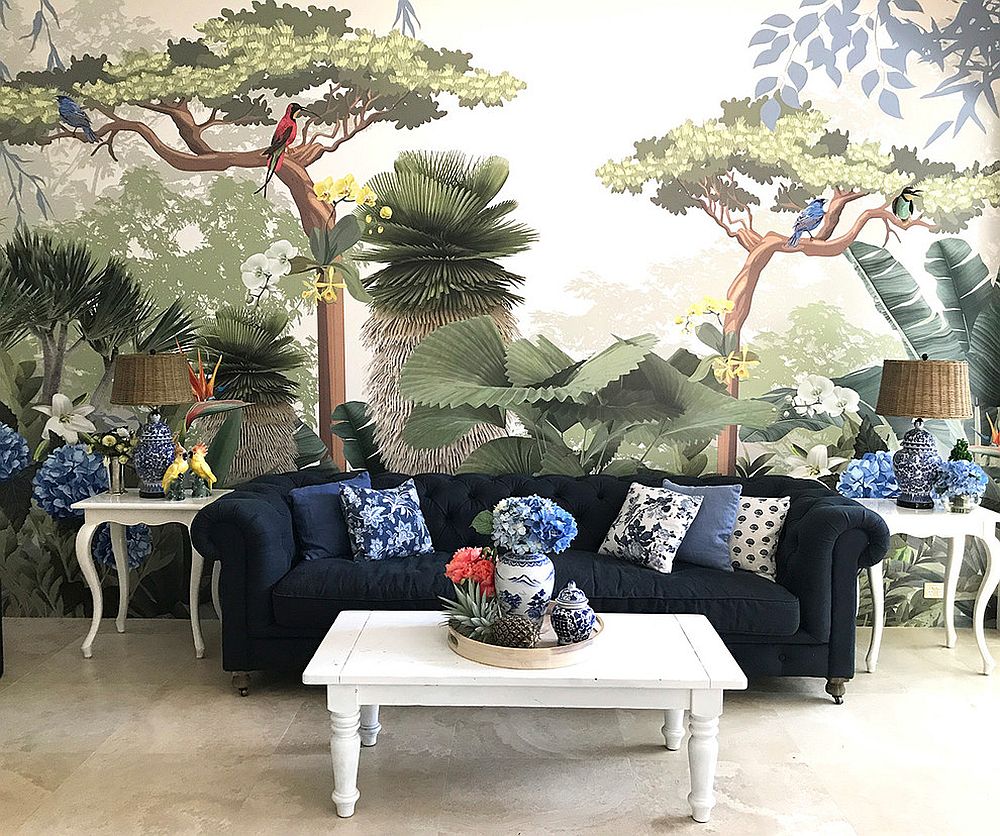 Pour un style tropical, voyez plus loin que les papiers peints aux motifs feuillus. Certains vont préférés des motifs de palmiers tandis que d’autres vont préférés des motifs plus colorés comme l’ananas ou des oiseaux. J’aime beaucoup ce papier peint panoramique ci-dessous. C’est un papier peint tropical un peu plus moderne que ce que l’on voit parfois.