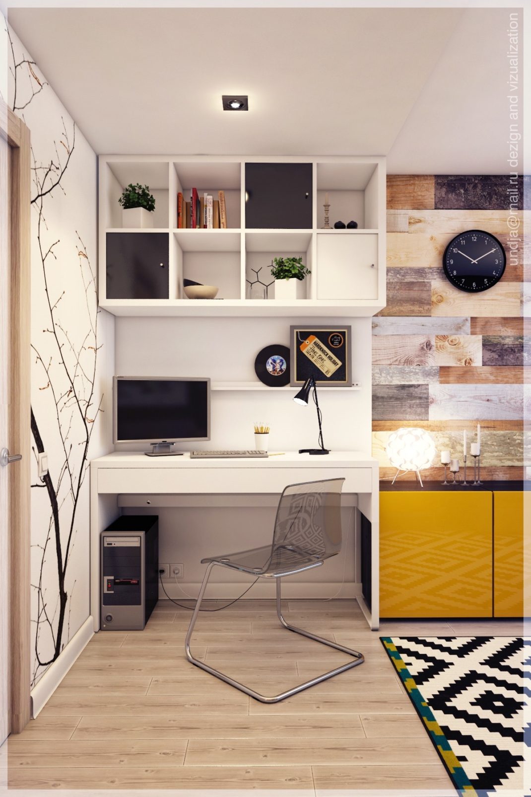 Alors que certaines personnes ont besoin de bureaux neutres pour se concentrer, d’autres préfèrent avoir un peu de couleur pour dynamiser leur bureau. Ce premier bureau pourrait convenir aux deux puisqu’il se concentre sur essentiel avec des étagères, une suspension et un bureau. Le tout relevé subitement avec un soupçon de jaune.