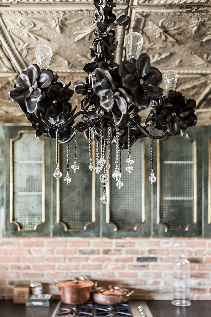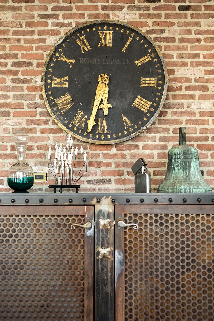 Ce que j’aime aussi, c’est le mélange des textures. Ici, le cuir français coloré côtoie les planchers chevrons en bois, les vases en verre et une ventilation métallique apparente.