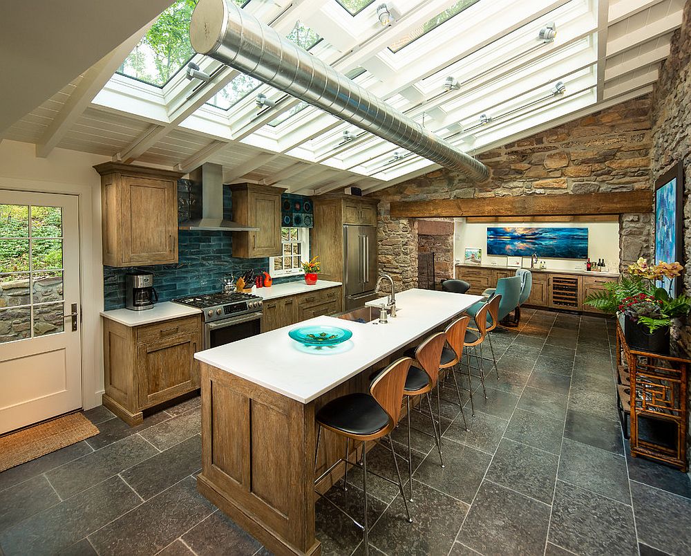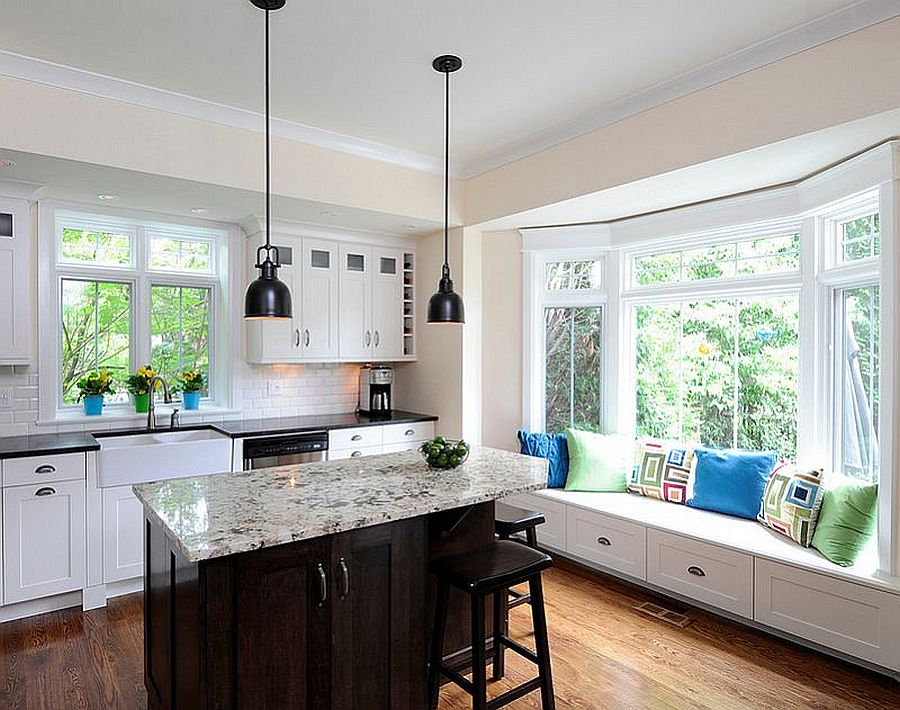 Étant donné que la plupart des cuisines modernes sont placées à la fin de l’espace ouvert, avec une connectivité au jardin, à la terrasse, au patio ou même à la vue extérieure, il est judicieux d’ajouter un siège à proximité de la fenêtre ou la baie vitrée. Aussi, pour les familles avec enfants, cela devient une option pratique permettant aux parents de garder un œil sur eux.