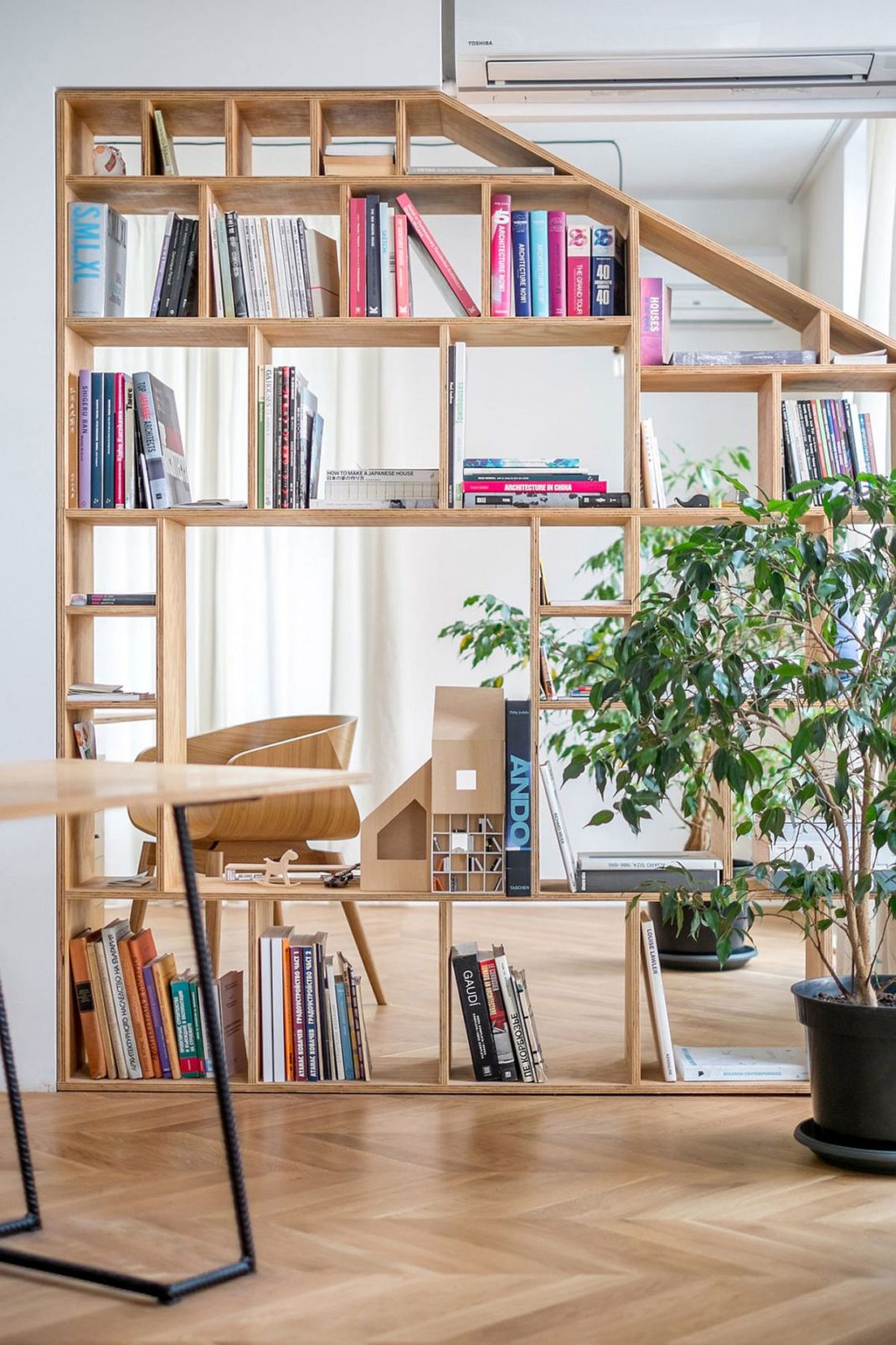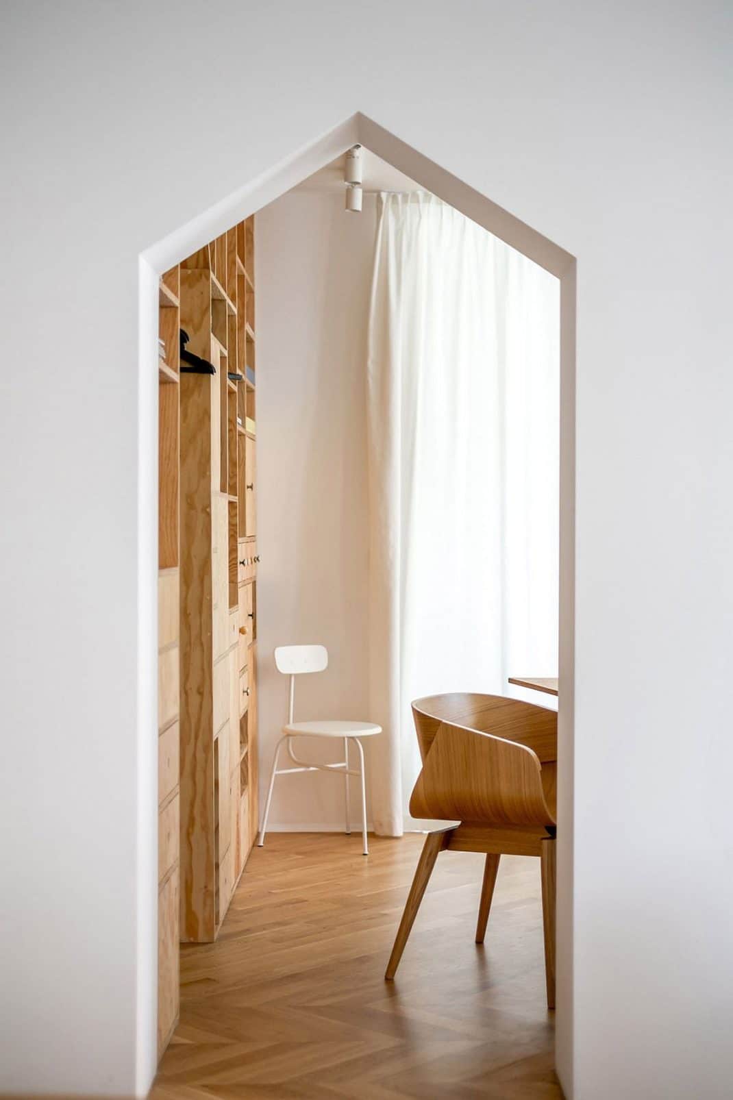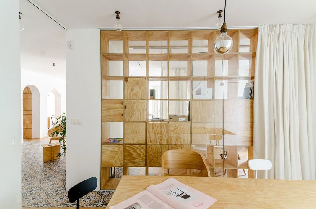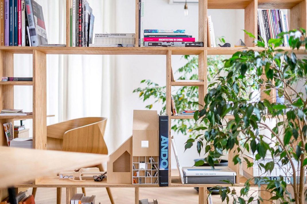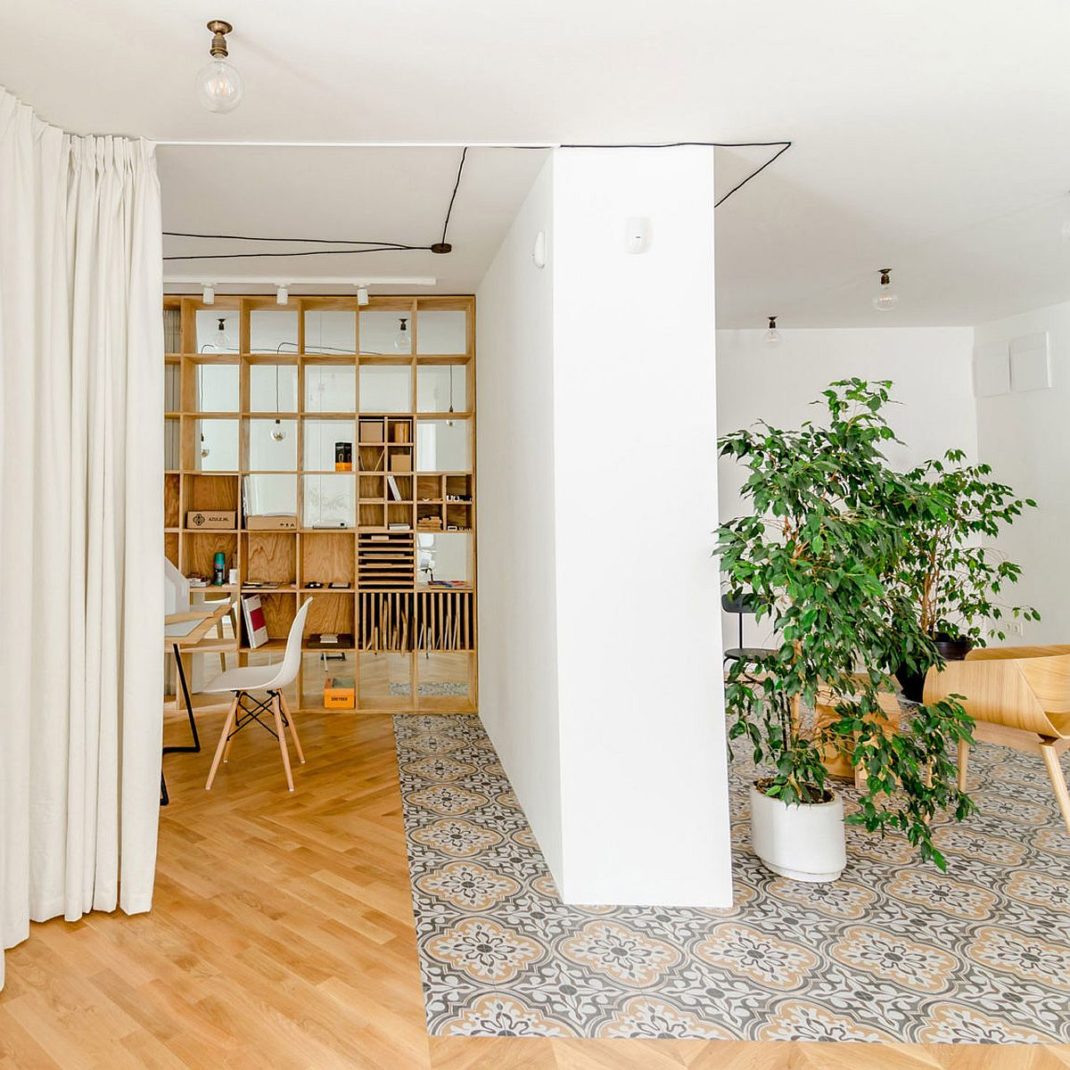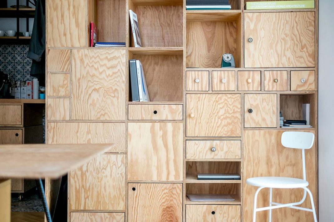 Outre la série d’étagères murales en contreplaqué, on remarque également une utilisation intelligente des rideaux. Ils peuvent être déplacés pour transformer instantanément une salle de réunion ou un bureau individuel. C’est une astuce que vous pouvez tout à fait reproduire chez vous sans trop de mal et avec un petit budget. Deux zones de travail différentes avec une cuisine, une salle de bain, un hall d’entrée et un balcon complètent le nouvel espace de travail. Vous le voyez, transformer un appartement en bureau peut se faire facilement. Juste avec quelques astuces déco !