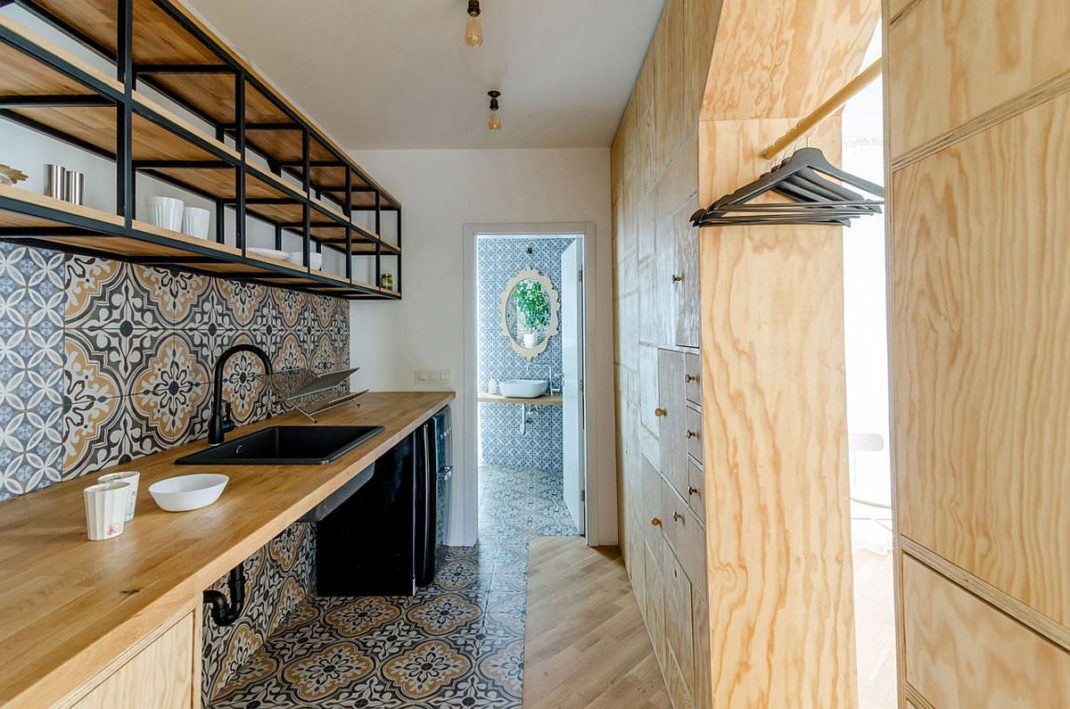 Ensuite, ici, pas de place pour un design stérile, on ose ! Transformer un appartement en bureau n’implique pas la monotonie. Sols en bois en chevron, décor en bois, joli carrelage dans la cuisine et la salle de bain ajoutent un contraste textural et visuel.