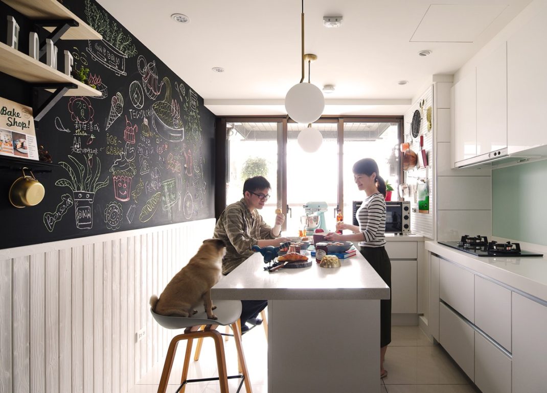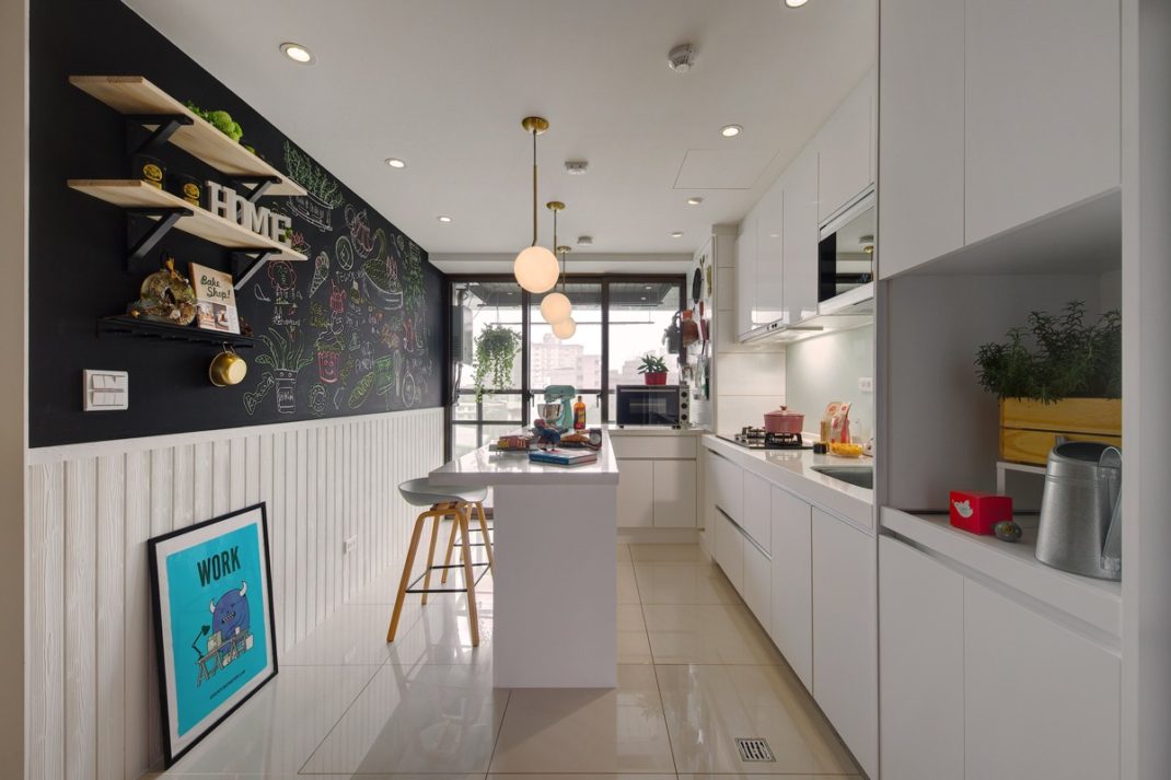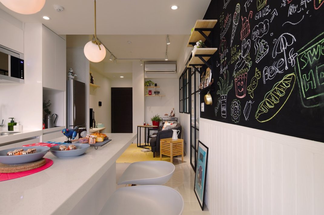 Autre détail intéressant de l’appartement imaginé par A Lentil Design : le mur ardoise. Ce dernier a été créé dans la cuisine afin d’y écrire et afficher des recettes, par exemple. Même si la cuisine n’est pas très grande, elle est très fonctionnelle. On y découvre de nombreuses armoires ainsi qu’un grand ilot central ; ouvrant aussi bien servir de table que de plan de travail.