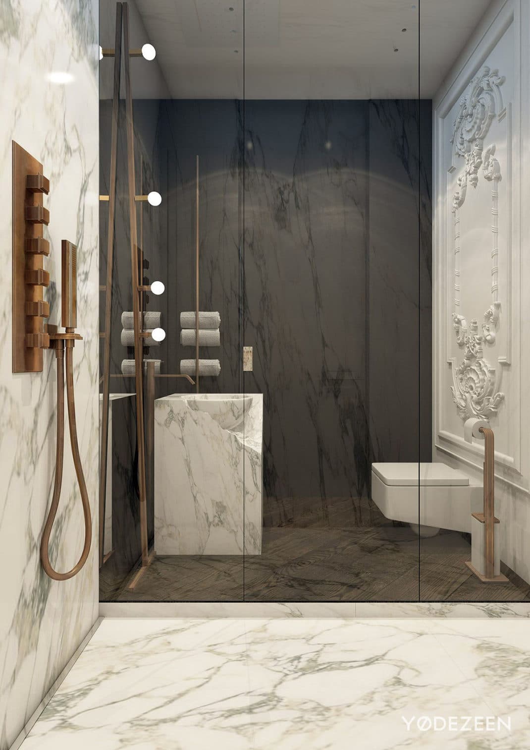 Dans le couloir, le planché posé en diagonale permettent de guider l’œil vers les zones plus intimes de la maison. L’influence classique est vraiment très forte dans la chambre de maître. Personnellement, je trouve que cette chambre spacieuse est une œuvre d’art ! Ça se passe de commentaire ! La salle de bain propose également des couleurs gris foncé et noir. Le marbre posé sur les murs et le sols est magnifique et réfléchit la lumière pour donner encore un peu plus d’ampleur à la pièce.