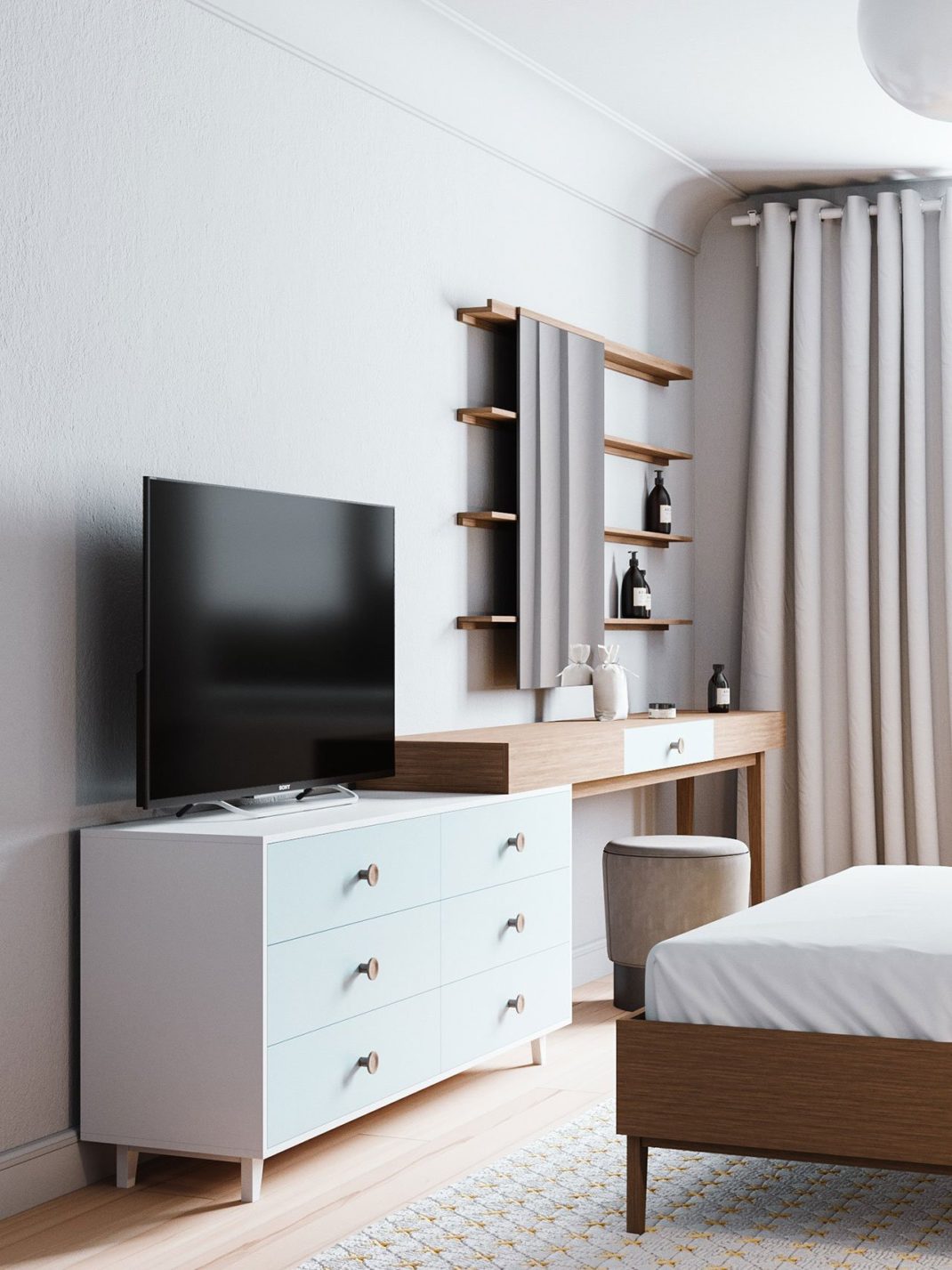 Enfin, la chambre propose aussi des couleurs neutres, avec des meubles assortis en bois clair et des pièces «d’accent» comme une commode et des tables d’appoint peintes dans un bleu aqua très léger.