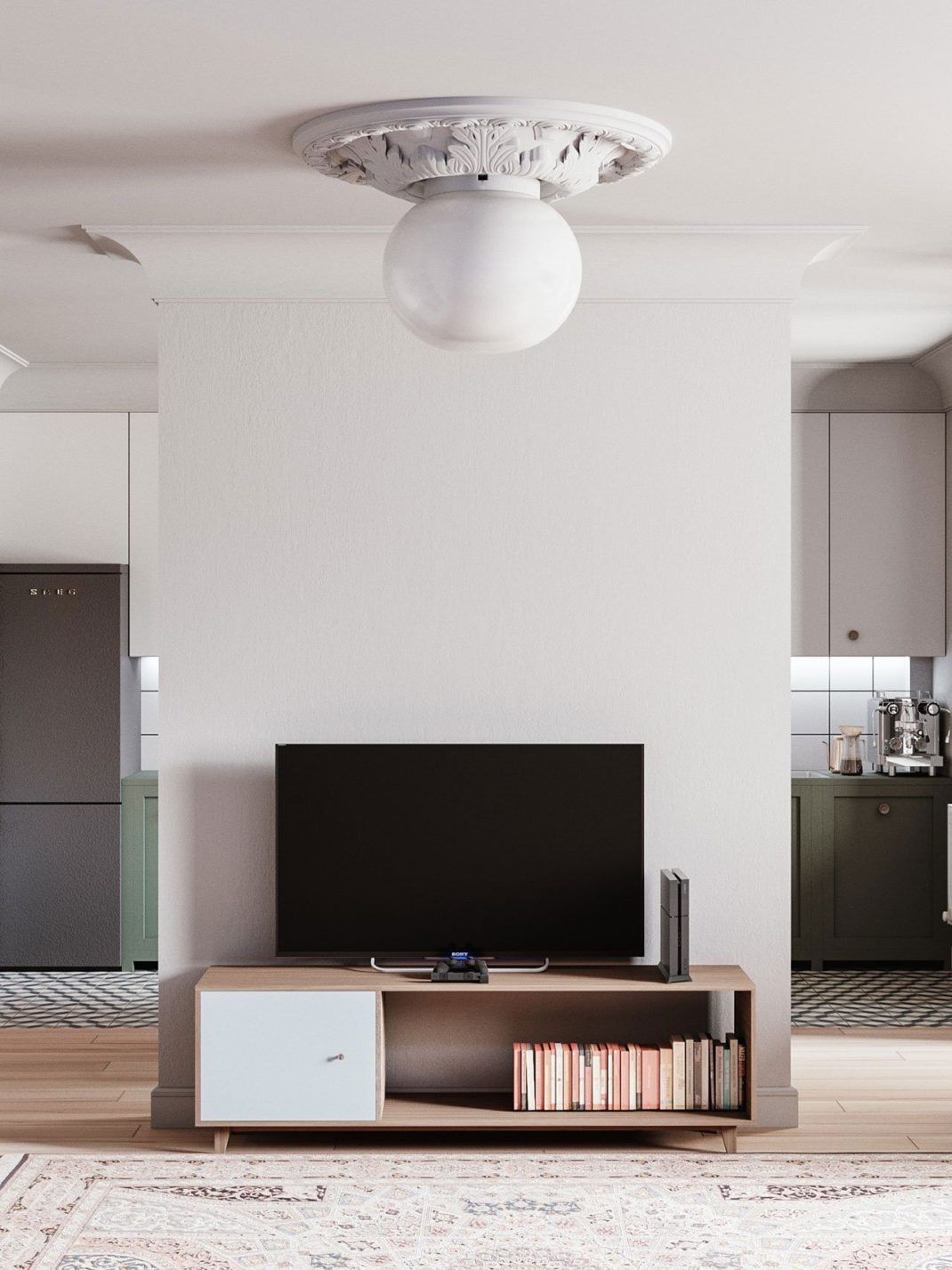 Ensuite, l’intervention spatiale majeure de la rénovation a été la séparation de la zone avant de l’appartement en deux zones distinctes de dimensions à peu près égales ; pour accueillir le salon et la cuisine-salle à manger. Bien que divisées par un mur de séparation, les deux pièces aux couleurs neutres ne sont pas complètement déconnectées ; avec un espace suffisant de chaque côté du mur de séparation. Cela permet le mouvement facile entre les deux espaces et assure leur connexion visuelle. La perspective que cela crée est franchement très réussit.