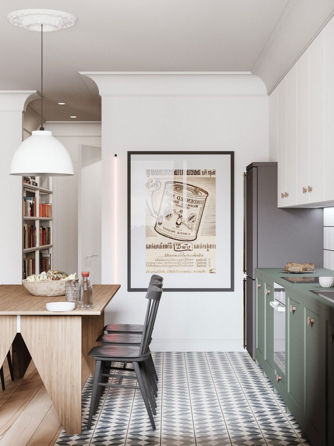 C’est dans la cuisine où les designers se sont le plus lâchés. Les planchers se mélangent à la perfection avec des carreaux à motif géométrique bleu ; tandis que les façades de style Shaker sont peintes en vert sauge. Sachez que ce type de sol est très tendance ces dernières années. Ainsi, ces éléments plus audacieux contrastent joliment avec les armoires blanches et un réfrigérateur gris foncé.