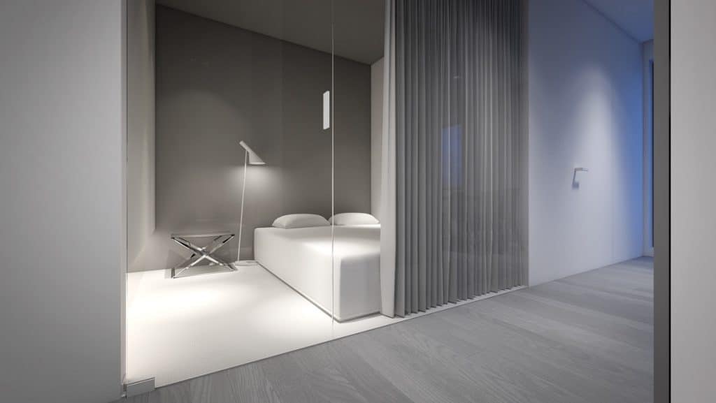 Dans les chambres et la salle de bain, c’est la même chose. Un décor minimaliste et aucune couleur ! L’ensemble est incroyablement sophistiqué. Certains préféreront l’adjectif aseptisé mais je trouve que l’ensemble fonctionne particulièrement bien ; à la condition de ne rien laisser traîner, c’est important pour le style minimaliste.