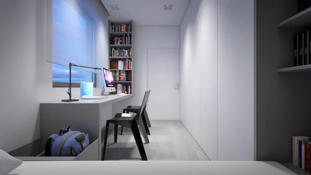 Comme incrusté dans le mur, un escalier gris et blanc permet de monter à l’étage. Le bureau qui s’y trouve reprend exactement la même thématique que celle du salon. Remarquez comme les armoires se confondent avec le mur et le plafond. La séparation est simplement matérialisée une lumière LED qui court tout le long des meubles.