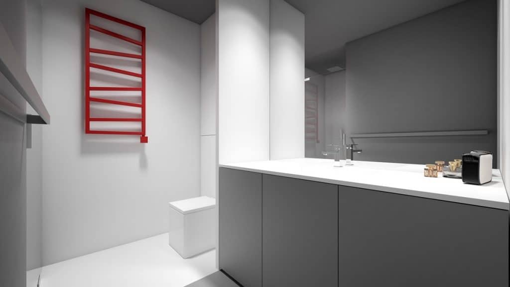 Enfin, de nombreuses sources de lumière directes et indirectes ont été installées pour compléter la lumière naturelle venant de l’extérieur. Afin de maîtriser cette lumière de nombreux rideaux ont été installés autour de fenêtres mais pas que … Etant donné que certaines cloisons sont vitrées, la lumière passe de pièce en pièce. Pour assurer un peu d’intimité et réguler les flots de lumières, des rideaux ont également été installés sur ces parois. Pour trouver une petite pointe de couleur dans cet appartement à la décor minimaliste, allez dans la salle de bain. Vous y découvrirez un radiateur chauffe serviette rouge très graphique.