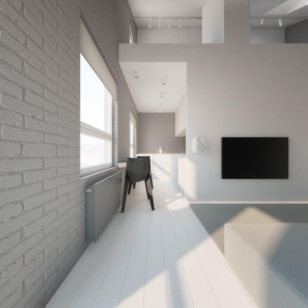 Notre premier intérieur utilise les trois palettes souvent secondaires dans un seul et même espace. Dans le salon, nous découvrons un carré composé d’un canapé en forme de L faisant face à une grande télévision noire. Les murs gris et blancs se transforment en formes géométriques et animent la pièce. Un mur en briques grises habillé avec un tableau noir (qui fait écho à la télévision) complète le tout.