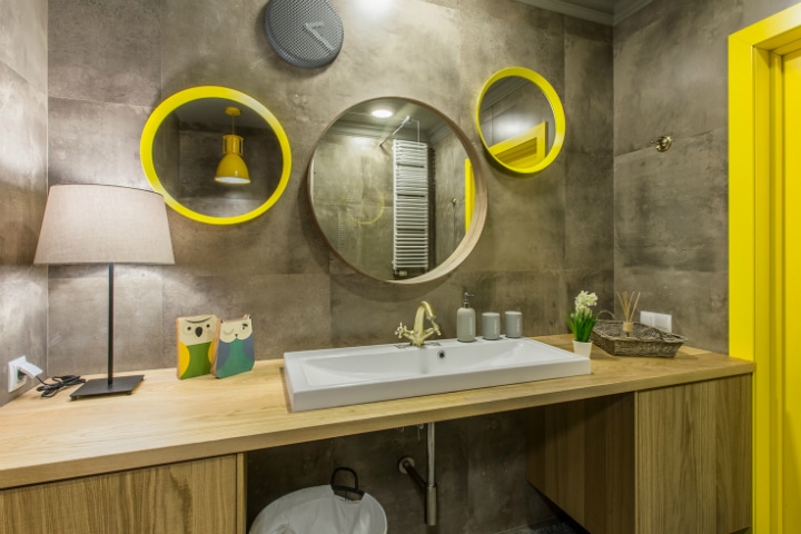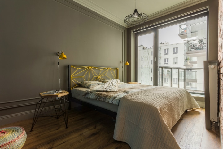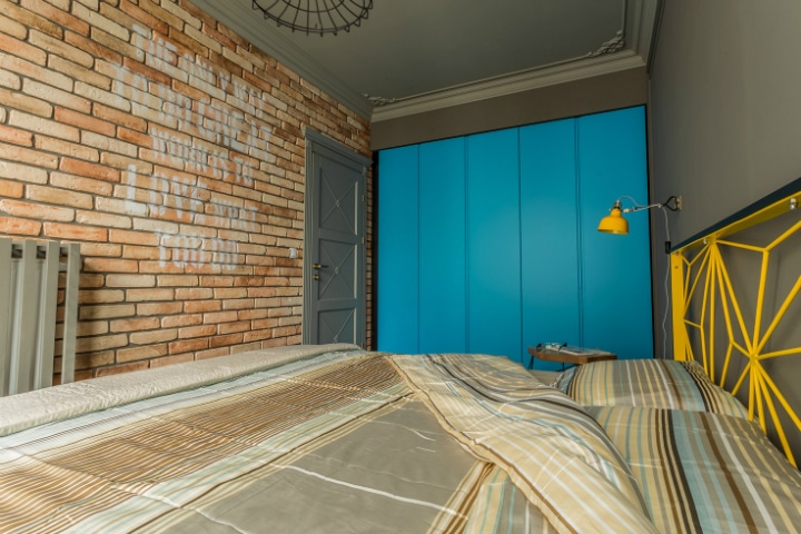 Dans la salle de bain, rien d’exceptionnel. L’espace est simple et fonctionnel. Ici le thème de la décoration jaune est présent de façon ultra subtile. Il en est de même dans la chambre. Dans cette pièce, R-DESIGN a aussi choisi de marier cette couleur avec un bleu paon très riche et profond pour créer un effet de contraste. Regardez les photos de la galerie ci-dessous, vous allez y découvrir plein de mariage de couleurs et de matière vraiment très réussi.