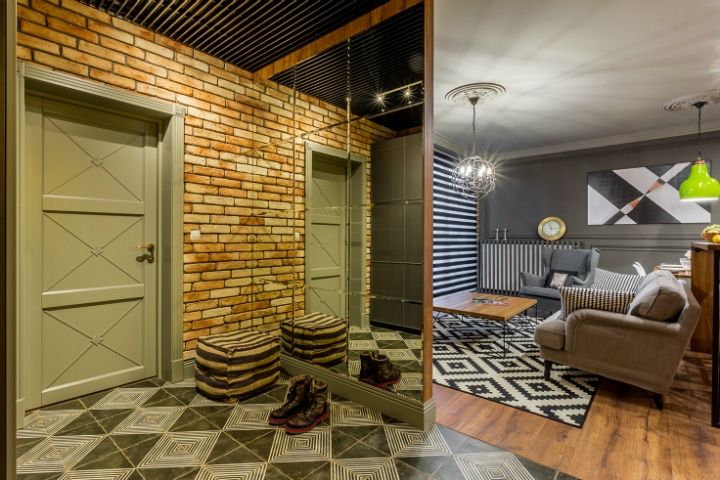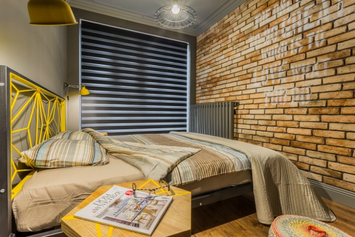 Ces teintes sont toujours dynamiques, peu importe l’espace où on les place. Que ce soit la chambre à coucher, la salle de bain ou la cuisine, elles apportent automatiquement un peu d’originalité à votre décoration intérieure. Ici les sièges de couleur jaune d’œuf s’accordent parfaitement avec le canapé beige sombre, le tapis géométrique dans les tons gris et le mur de briques apparentes. Tout cela contribue à créer une ambiance douillette et confortable.