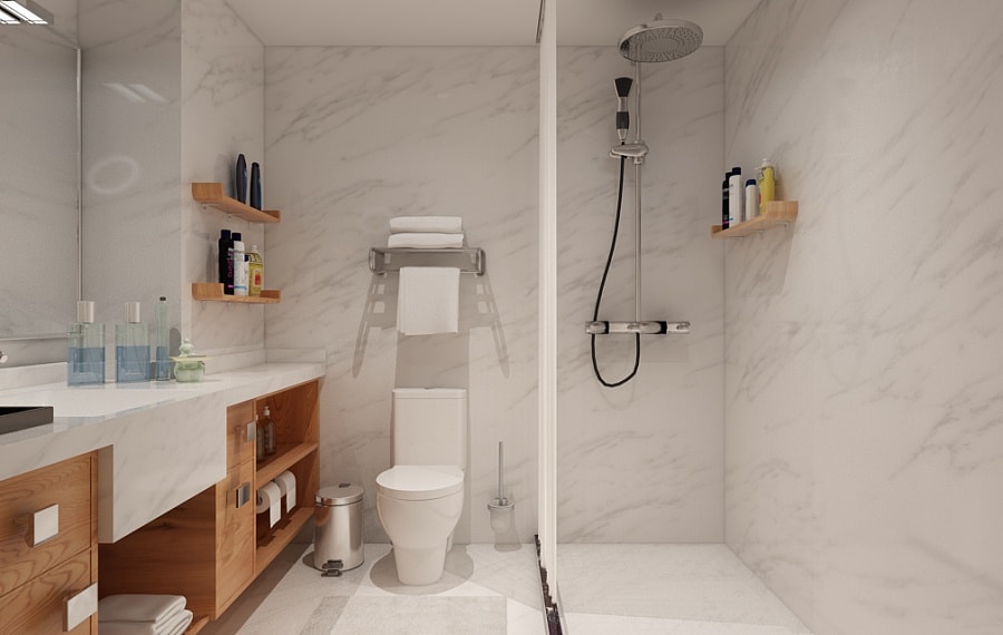 Notons tout de même l’utilisation de nombreuses formes organiques délicates qui créent un espace très aéré. De plus le grain du marbre renforce le côté naturel et nature de la pièce. Petite astuce : pour conserver une communication visuelle entre les pièces tout en s’habitant du bruit et des odeurs, une cloison en vitre a été installée.