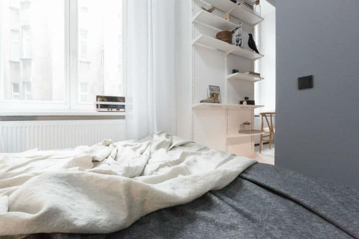 Juste à côté du salon se trouve le coin salle à manger. Il a été aménagé avec une table blanche très simple et deux chaises en bois. Un rack mural a été installé et est utilisé comme une étagère. Dans la prolongation de la pièce, la chambre n’a été habillée que d’un lit et d’une petite table basse. Notez que malgré le dépouillement de la pièce, les différents accessoires textiles habillent le lit et toute la pièce.