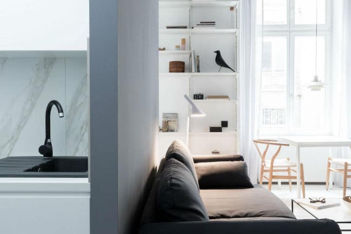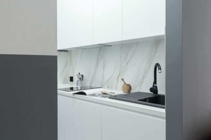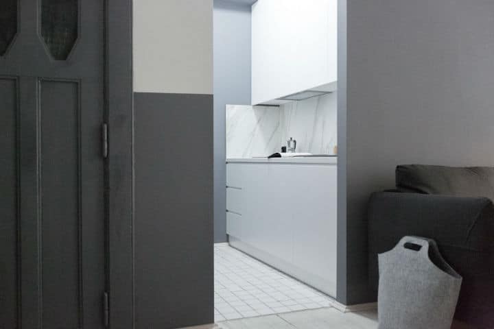 De l’autre côté de appartement, après le salon, la cuisine a été aménagée avec des placards blancs et des carreaux de marbre blancs. Pour relever l’ensemble, un évier et un robinet noir contrastent à merveille.
