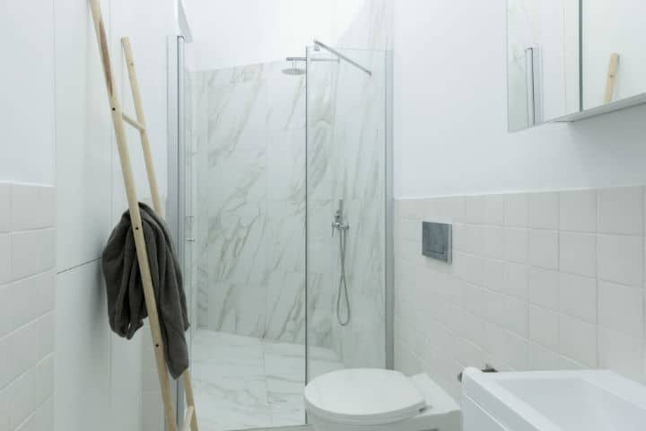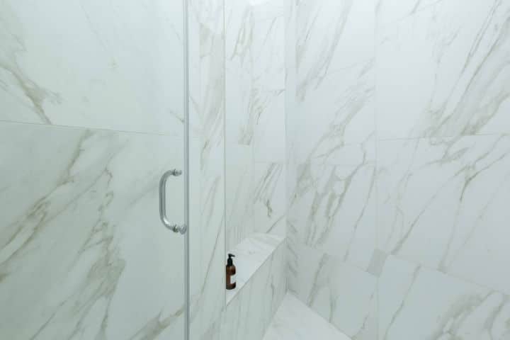 Terminons notre visite avec la salle de bain. Le petit détail : la douche reprend la même cloison en verre que la chambre ; manque juste un petit banc de douche. Le tout est complété par un beau carrelage blanc et verre très moderne. Comme dans la chambre et la salle à manger, l’ajout d’une peinture encadrée fait toute la différence et apporte de la couleur de façon subtile et équilibrée.