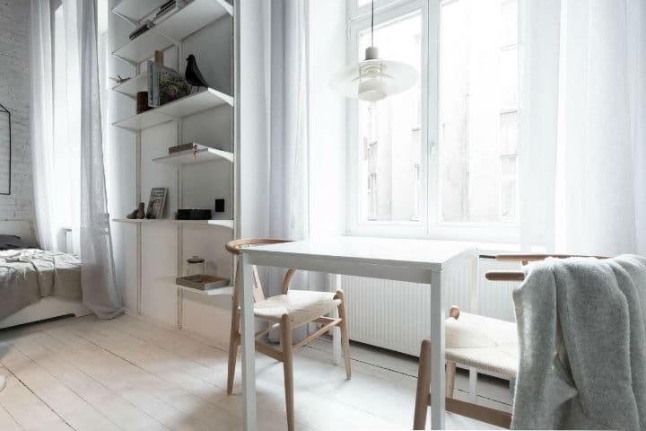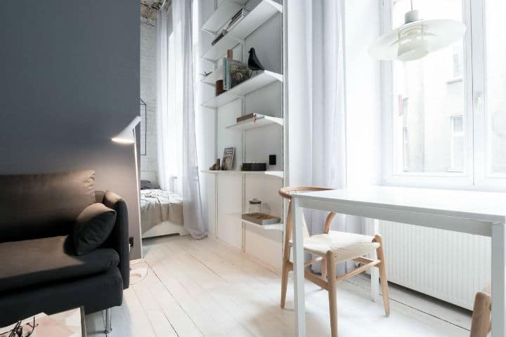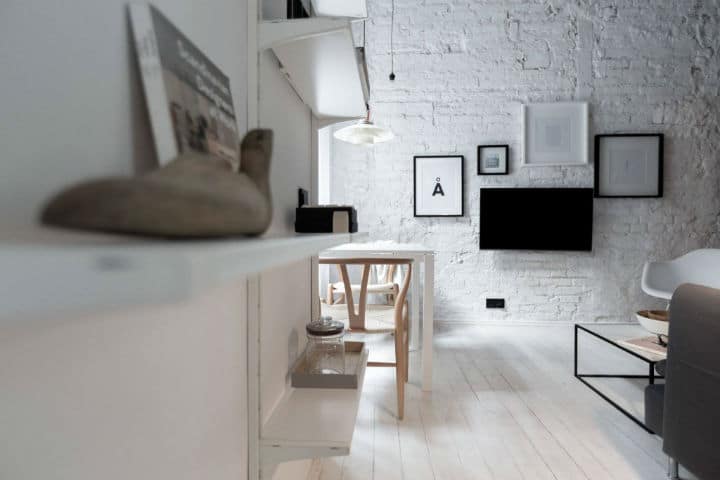 La lumière joue un rôle très important dans tout type de maison ou d’appartement ; mais plus encore pour les petites surfaces. Ici, l’appartement bénéfice d’une belle lumière naturelle grâce à des grandes fenêtres. Mais si vous n’avez pas la chance d’avoir autant de lumière chez vous, assurez-vous de placer assez de luminaires.