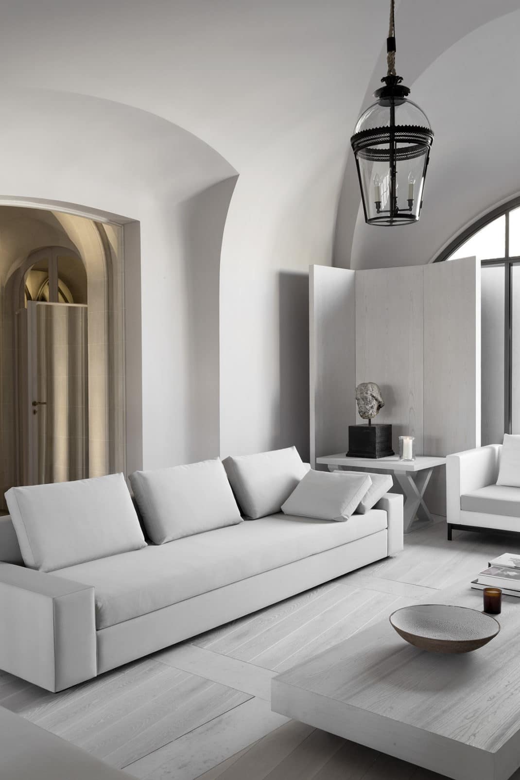 L’approche esthétique de Guillaume Alan est minimaliste mais elle s’inspire toujours de l’histoire. Le salon, par exemple, a un plafond voûté inhabituel qui encadre une grande fenêtre cintrée inspirée d’une vieille porte d’Oxford. Une cheminée en marbre de 3 m de long enjambe le salon et semble flotter comme si elle était suspendue.