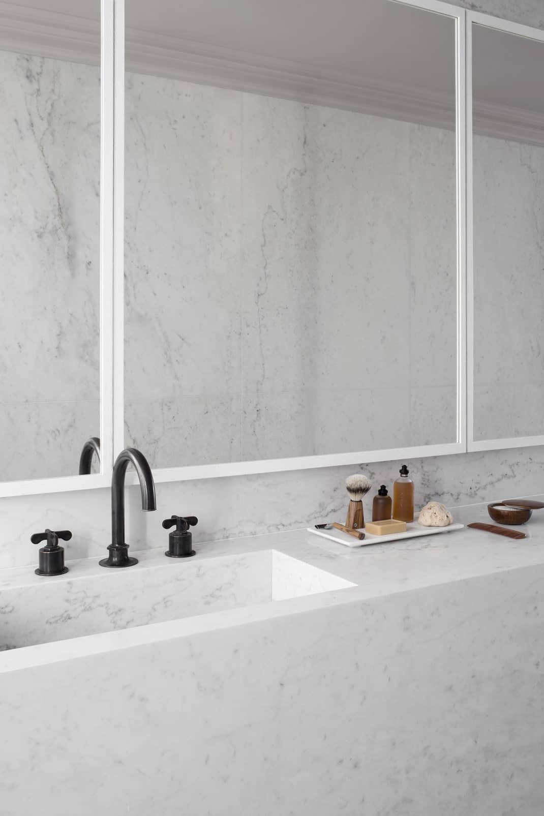 Le marbre de Carrare utilisé par Guillaume Alan dans la salle de bain peut également être trouvé ailleurs dans l’appartement. Notamment dans la cuisine mais également sur les sols où il contraste avec le chêne brossé gris clair pour créer un motif de surface et fournir un contraste de texture. Le choix des matériaux utilisés dans le projet a été minutieux. Chaque pièce de marbre ayant été choisie de manière non uniforme pour son motif.