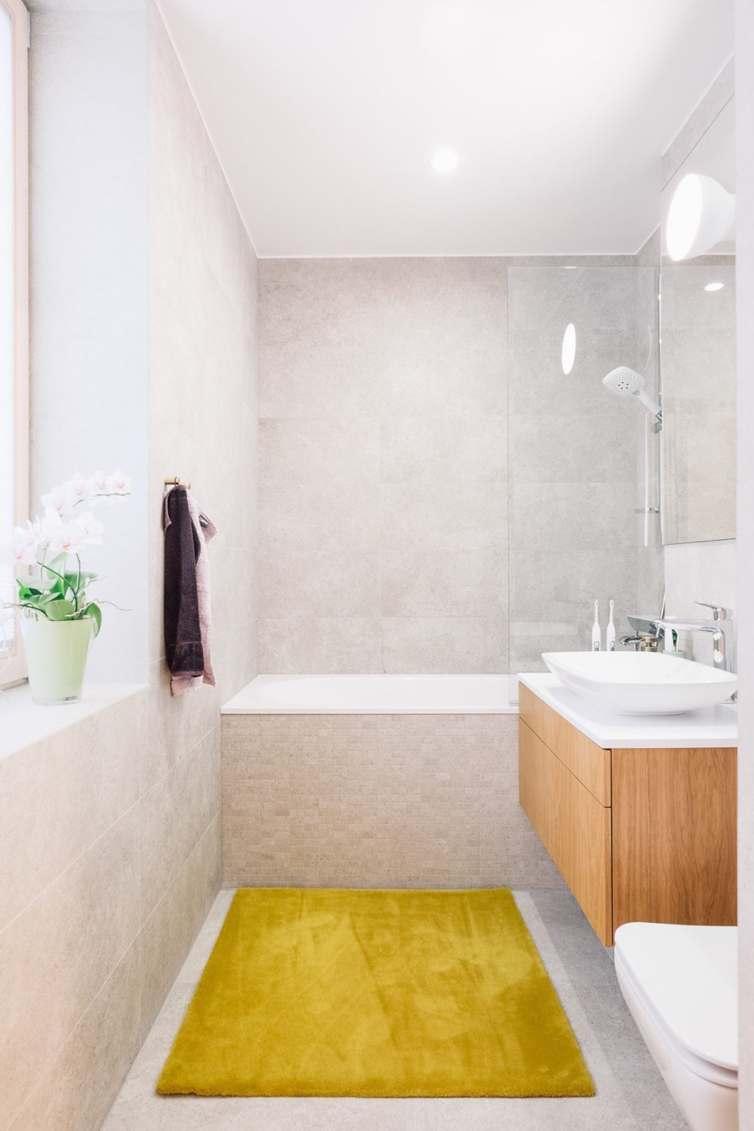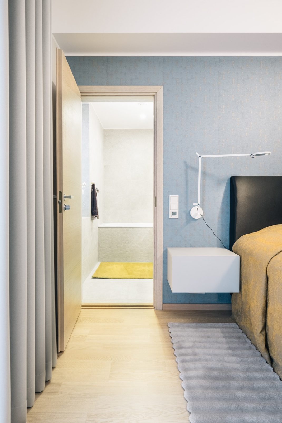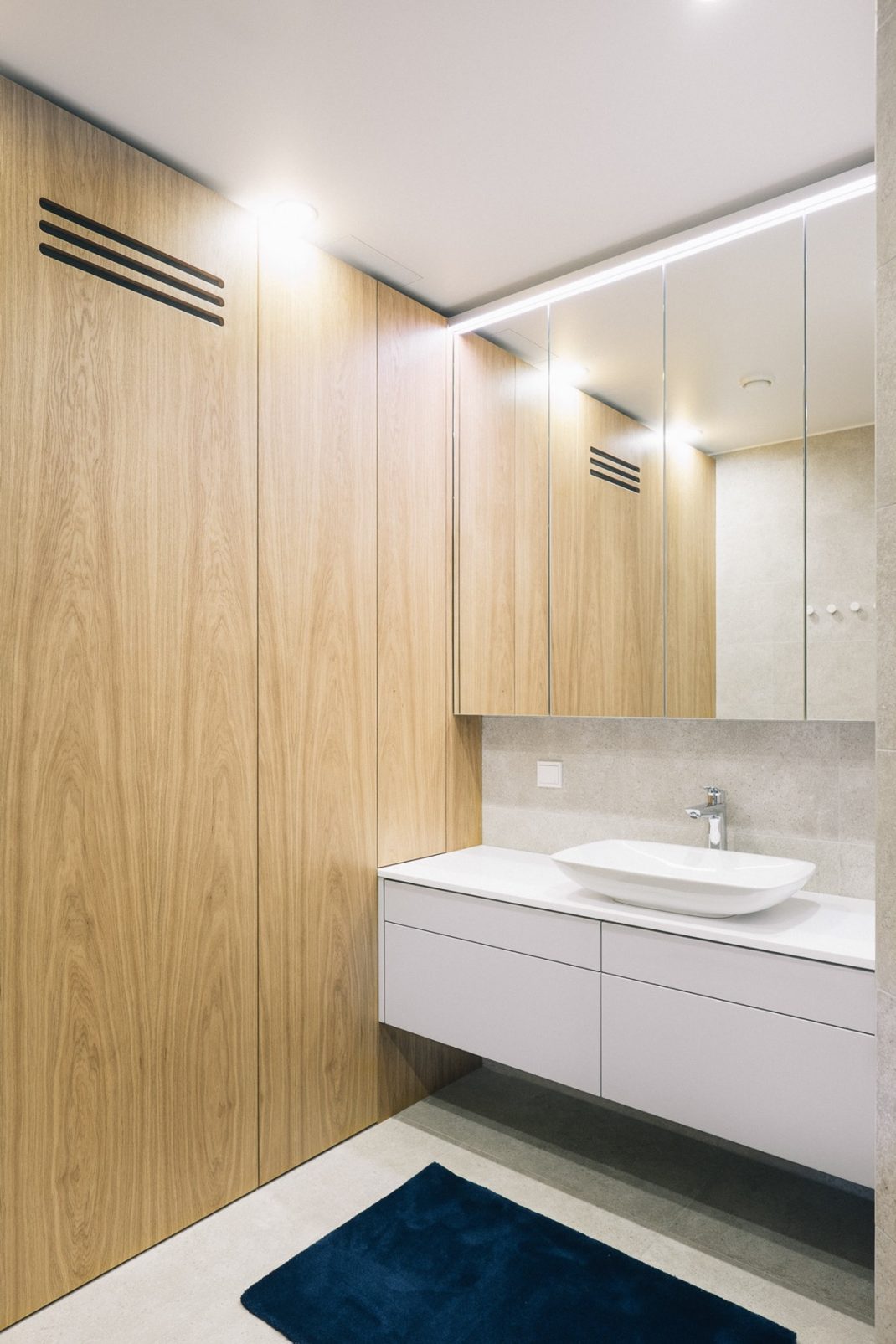 La chambre principale imaginée par Ines Käärma dispose de sa propre salle de bain. A l’intérieur de la salle de bain : du bois plus clair et un tapis bleu. J’aime beaucoup ce mélange ! Au-dessus du meuble-lavabo mural se trouvent quatre grandes armoires à miroirs, offrant suffisamment d’espace pour ranger tous les produits de beauté et les articles de toilette.