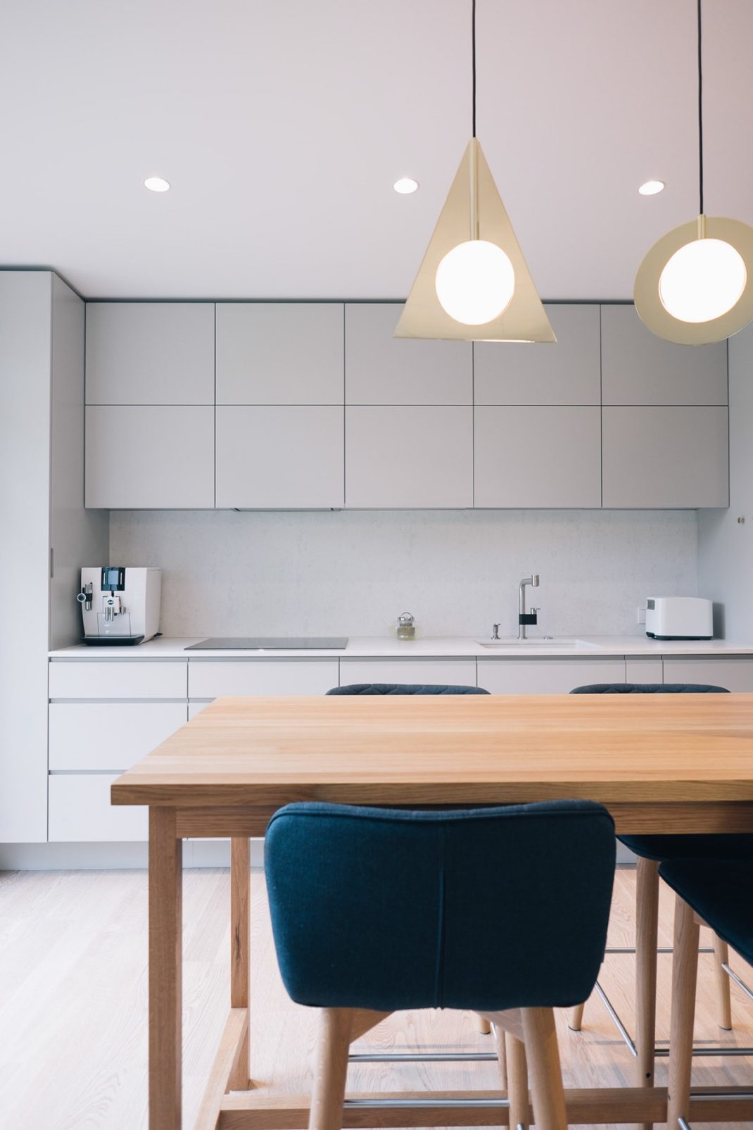 Un mur partiel permet aussi de scinder l’espace salon et la cuisine. Une cuisine très simple avec des armoires sans façade, sans poignée, avec un comptoir en corian blanc assorti. Même l’évier de cuisine et la machine à café sont blancs. Seul le plan de cuisson intégré et le four intégré contrastent avec le reste des éléments.