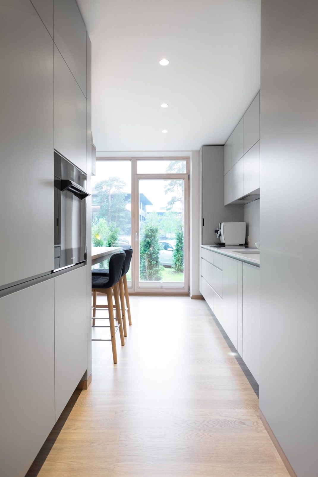 Un mur partiel permet aussi de scinder l’espace salon et la cuisine. Une cuisine très simple avec des armoires sans façade, sans poignée, avec un comptoir en corian blanc assorti. Même l’évier de cuisine et la machine à café sont blancs. Seul le plan de cuisson intégré et le four intégré contrastent avec le reste des éléments.