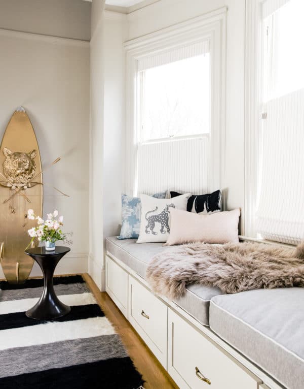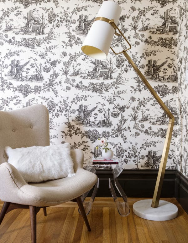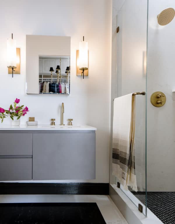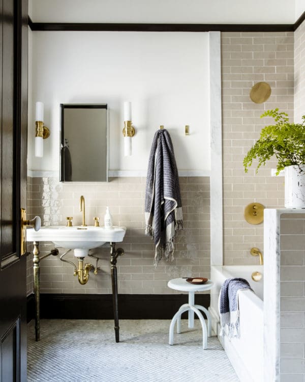 Vous le voyez, le thème global lumineux et moderne de cette maison se marie assez bien avec des pointes de noir et un sol en bois assez rustique. Irene Edwards étant amoureuses des choses qui brillent, de nombreux luminaires dorés ont été ajoutés dans différentes zones de la maison. Même les tringles de rideaux, les robinets de la salle de bain et des lampes à poser proposent cette finition dorée.