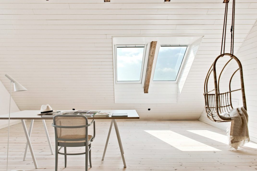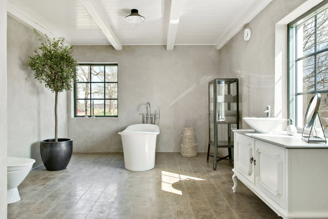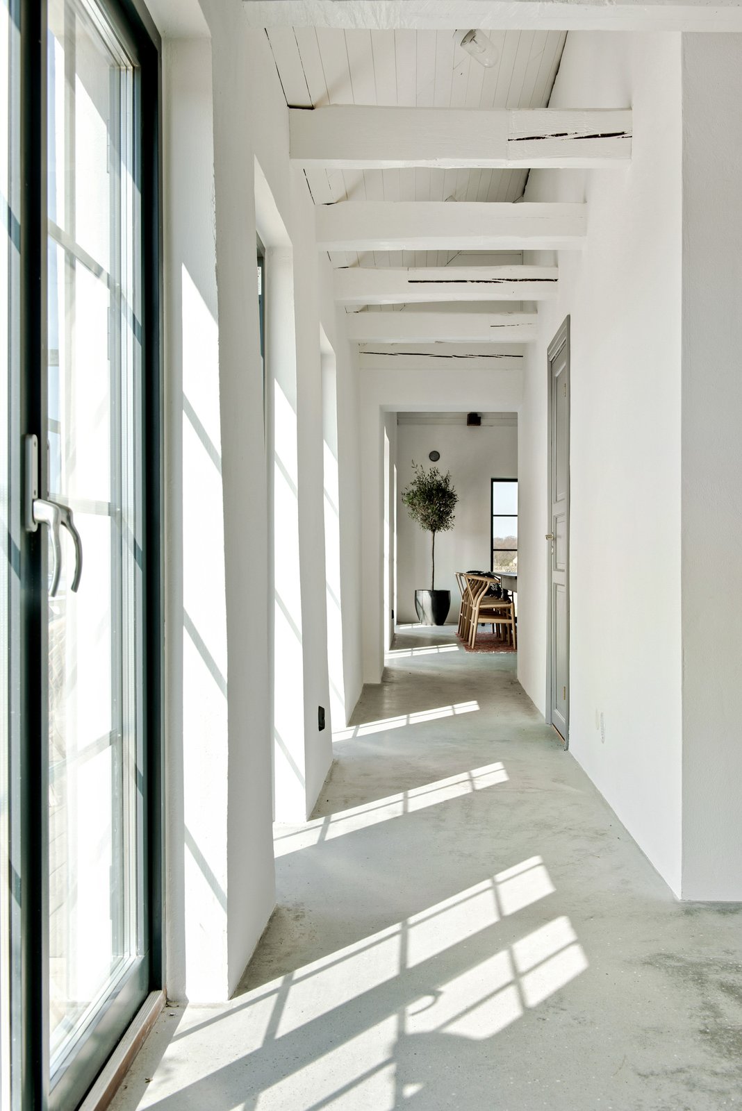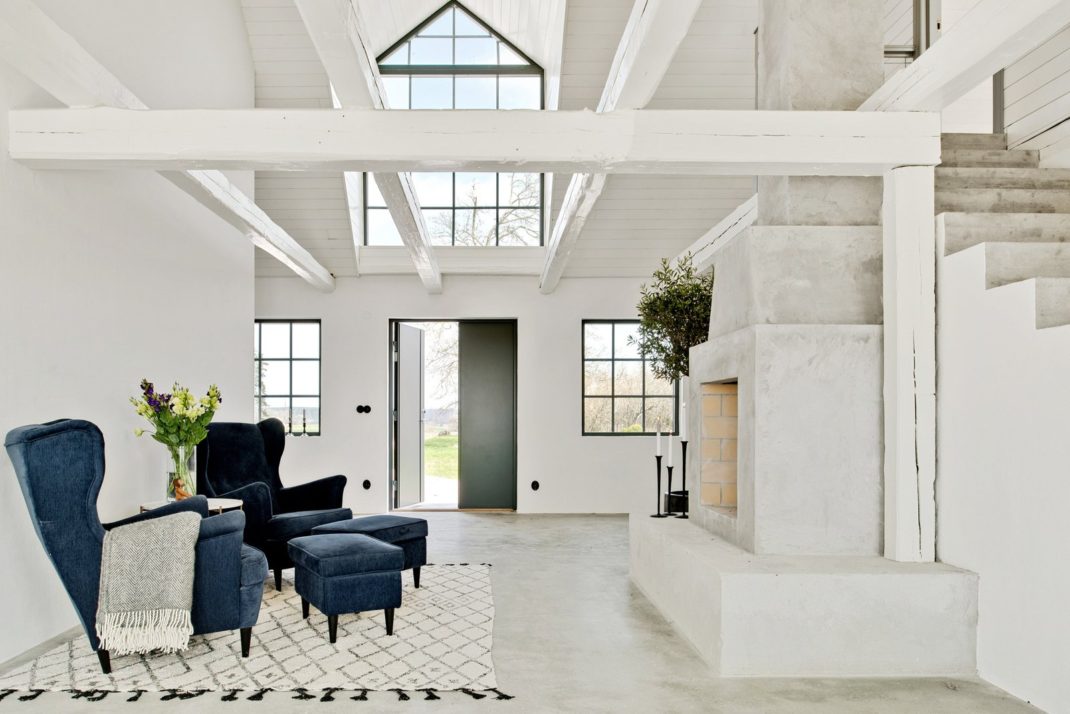 A l’intérieur, cette maison historique Suédoise dispose de poutres apparentes en bois rustiques de toute beauté. Ainsi, les sols en béton coulé et les murs en plâtre blanc permettent de donner un aspect lumineux et frais à cet intérieur.
