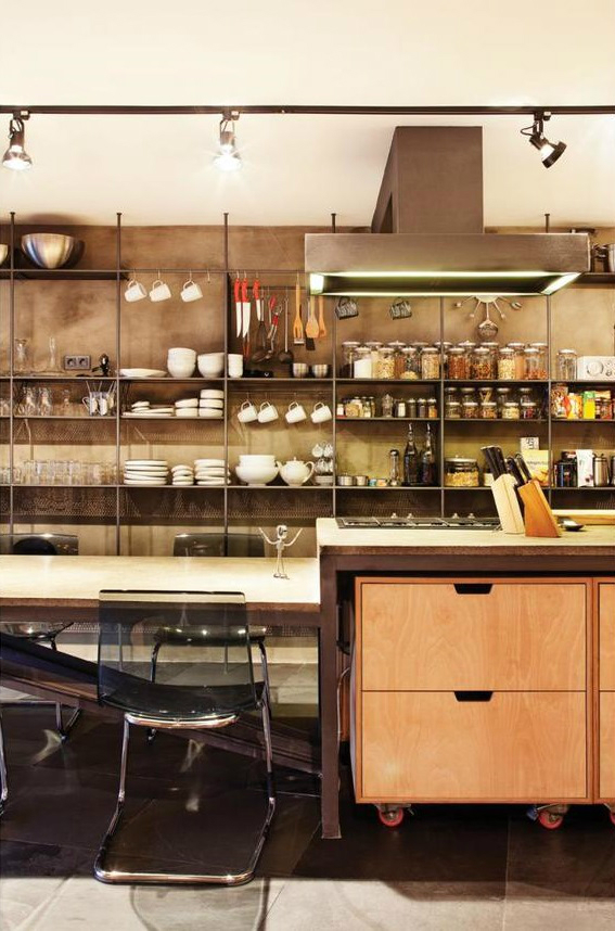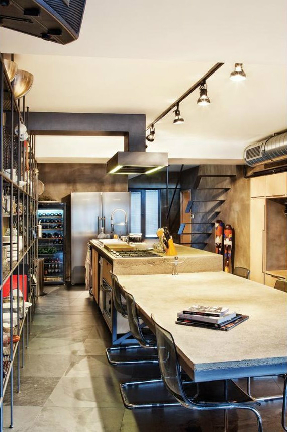 Ofist a largement utilisé le métal pour donner du cachet à ce loft industriel en duplex. Dans cette pièce déjà très spacieuse, la fenêtre ajoute encore une dimension supplémentaire à l’ensemble. Le mobilier modulaire, les rayonnages métalliques avec divers bibelots, le foyer au design unique, la table basse, etc., se marient à la perfection … et je dirais même plus, fusionnent à la perfection.